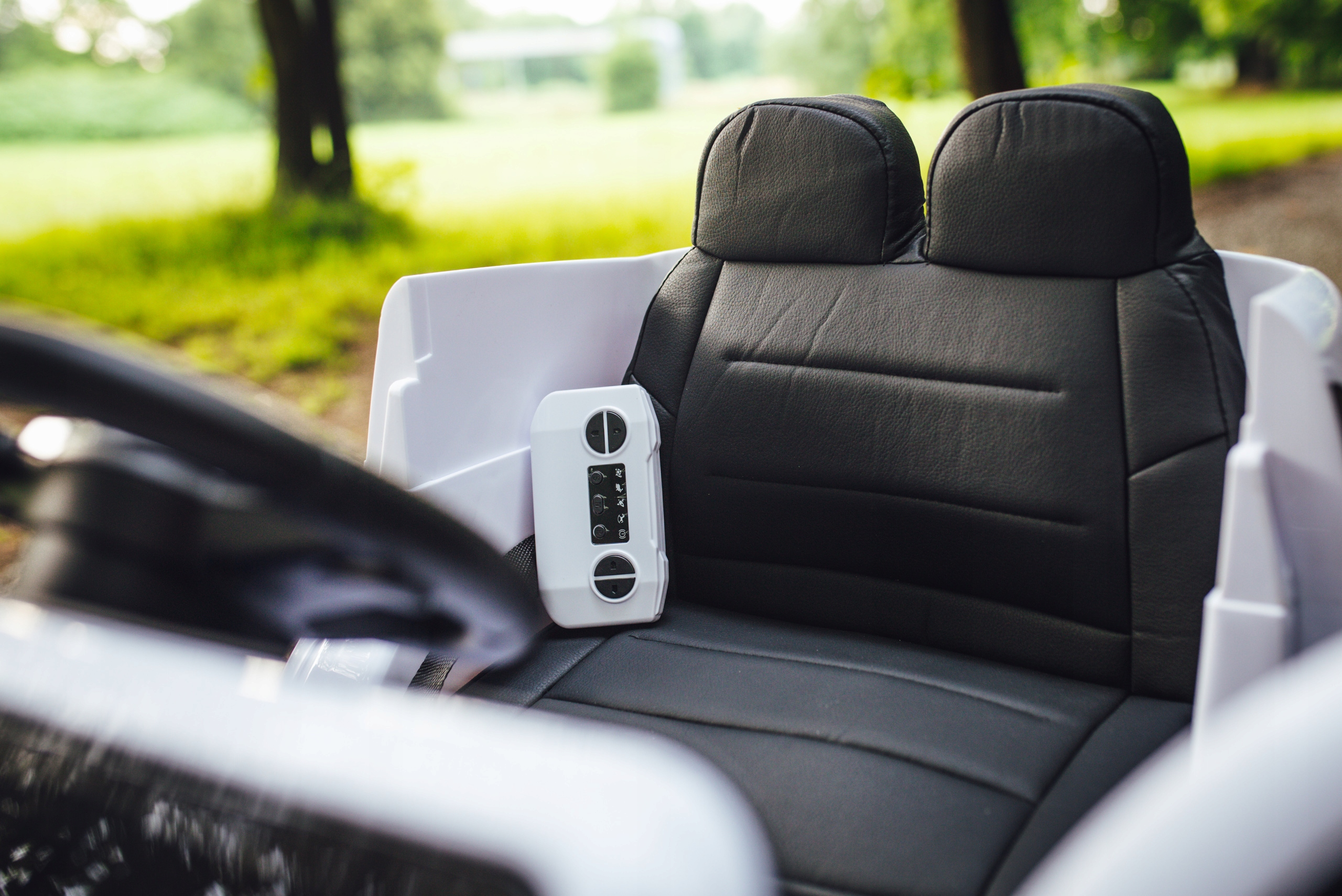 В автомобиле установлено широкое кожаное сиденье с высокой спинкой, профилированное таким образом, чтобы маленькому водителю было максимально комфортно. Безопасность во время движения обеспечат специальные ремни и замок, защищающие дверь от открывания. Опция медленный старт означает, что машина не тормозит при трогании и торможении, а плавно регулирует скорость, чтобы ребенок не боялся рывков.