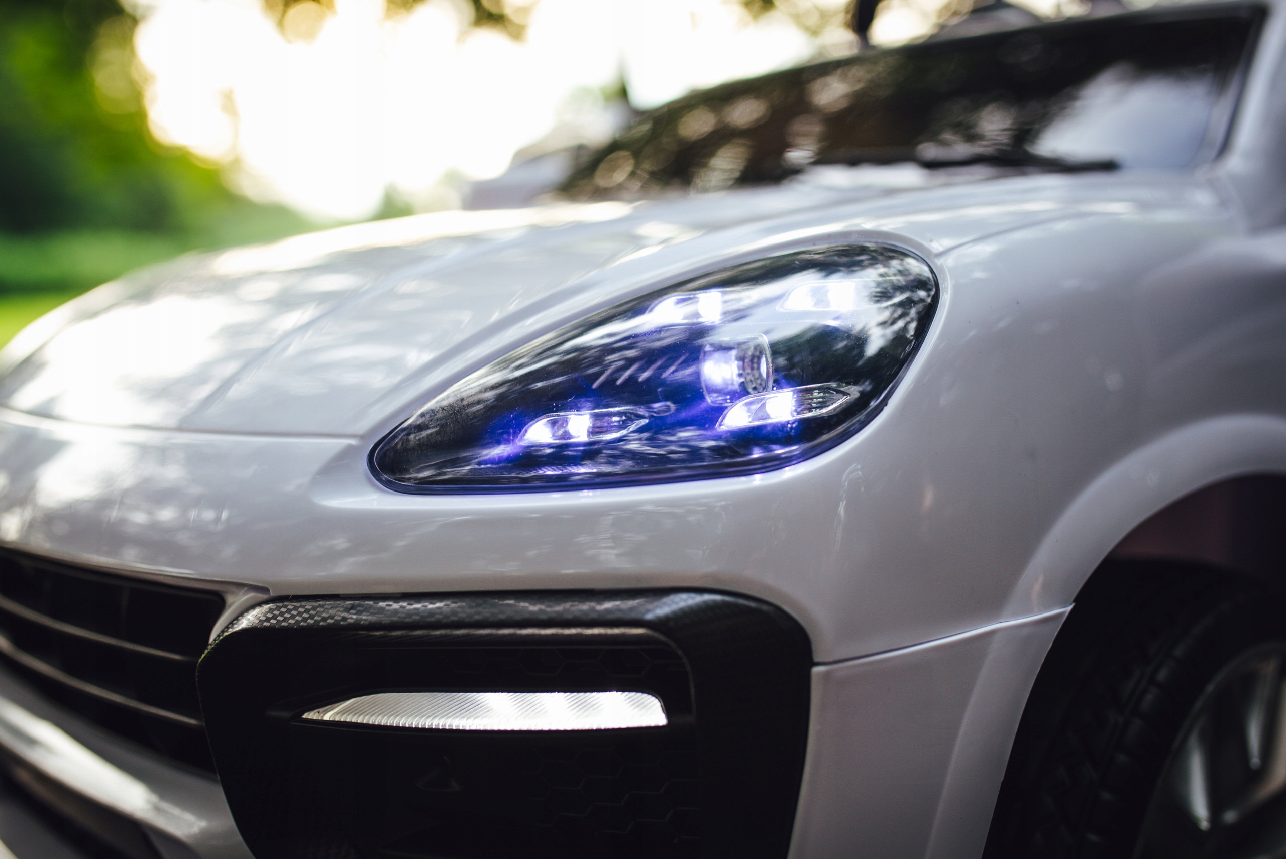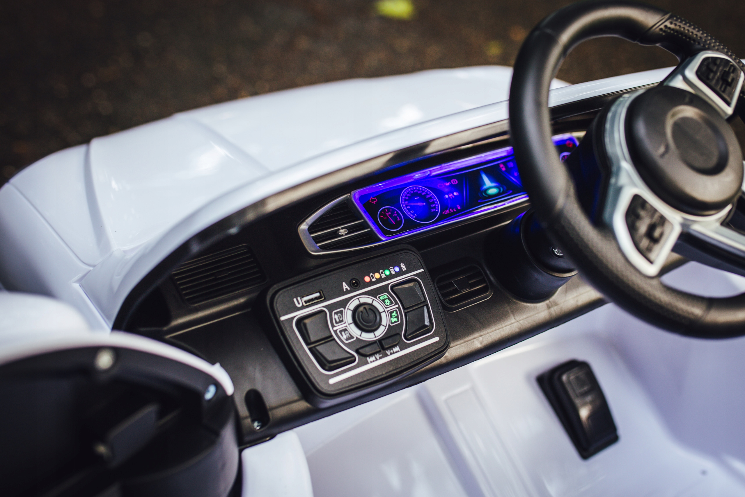 Автомобиль оснащен звуковым рулевым колесом - звук гудка, запуска двигателя и различные мелодии. Дополнительная музыкальная панель позволяет подключать любимую музыку через порт USB/AUX. Автомобиль оснащен светодиодными фонарями, а также индикатором уровня заряда аккумулятора и часами с подсветкой.