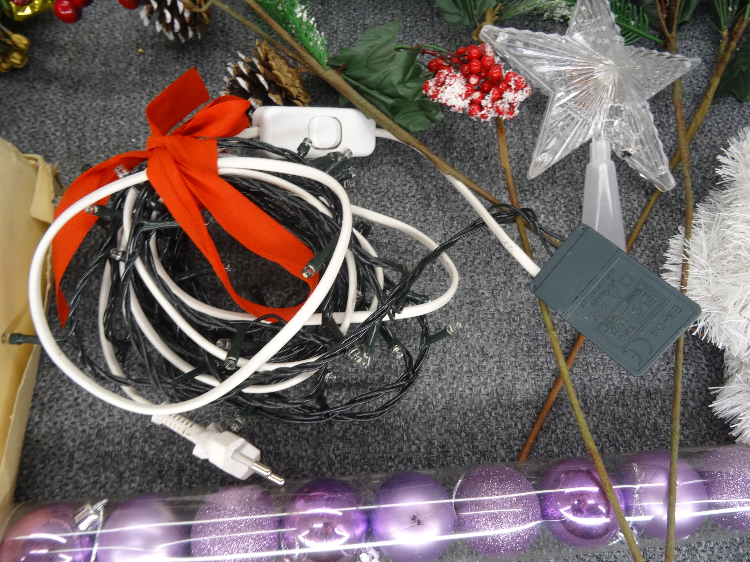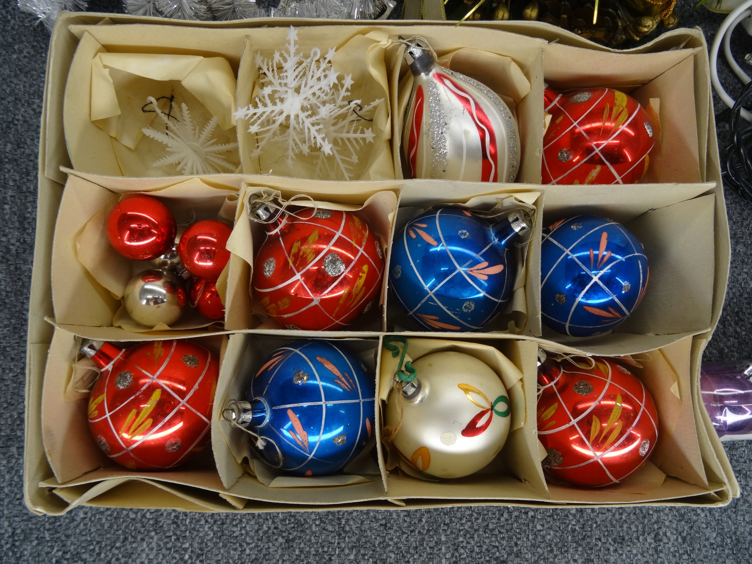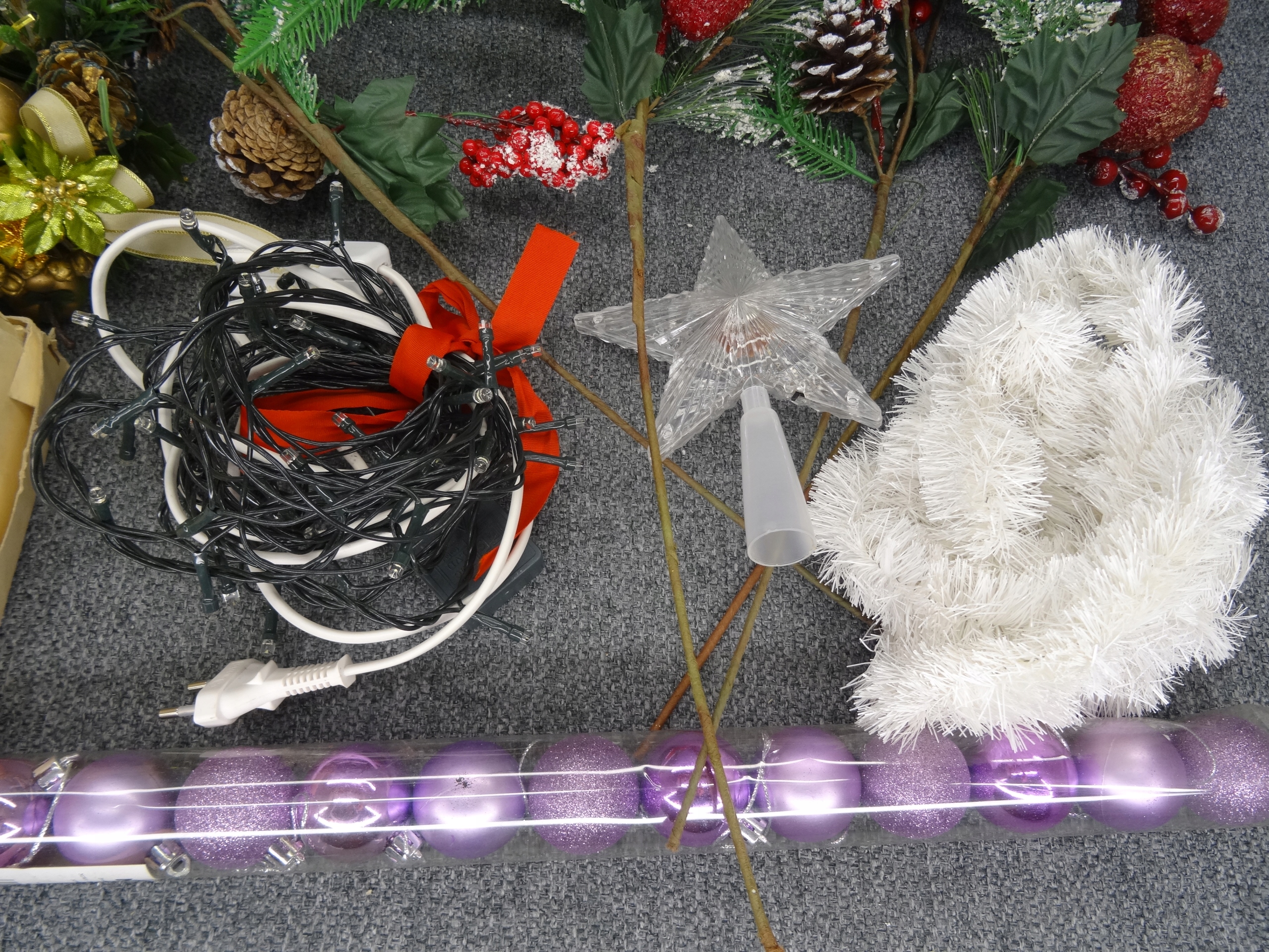 Большой новогодний набор; Елочные игрушки, венки, лампа в виде пингвина, звезды, длинные гирлянды, звезды, елочные вуали. 12 фенечек в пластиковом чехле, остальные стеклянные. Стеклянные безделушки периода Польской Народной Республики.