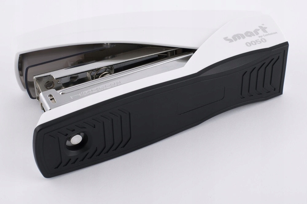 Стаплер изготовлен из прочного пластика, внутри он имеет металлический механизм.