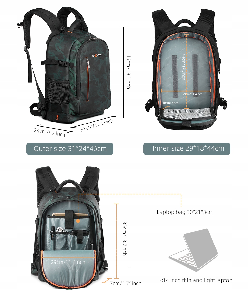 Очень вместительный и функциональный фоторюкзак K&F Concept черно-зеленого цвета, имитирующий лесной камуфляж. Просторное основное отделение с доступом сзади позволит комфортно и безопасно перевозить практически любую камеру или объектив.