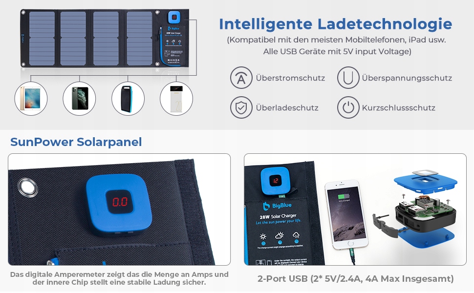 Bigblue 28w Portable Solar Solar Solar Charger 4 -port USB 4 водонепроницаемой солнечной панели с цифровым амперметом и молнией для защиты - для зарядки USB -устройств - iPhone Android Go Pro и т. Д. Система, которая обеспечивает стабильную плату. Высокоэффективные солнечные элементы изменяются до 21,5% - 23,5% солнечной энергии при свободной электроэнергии вокруг
