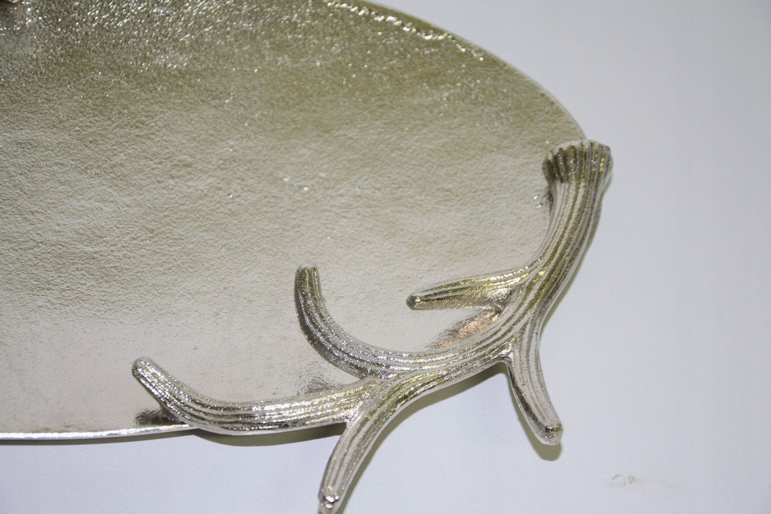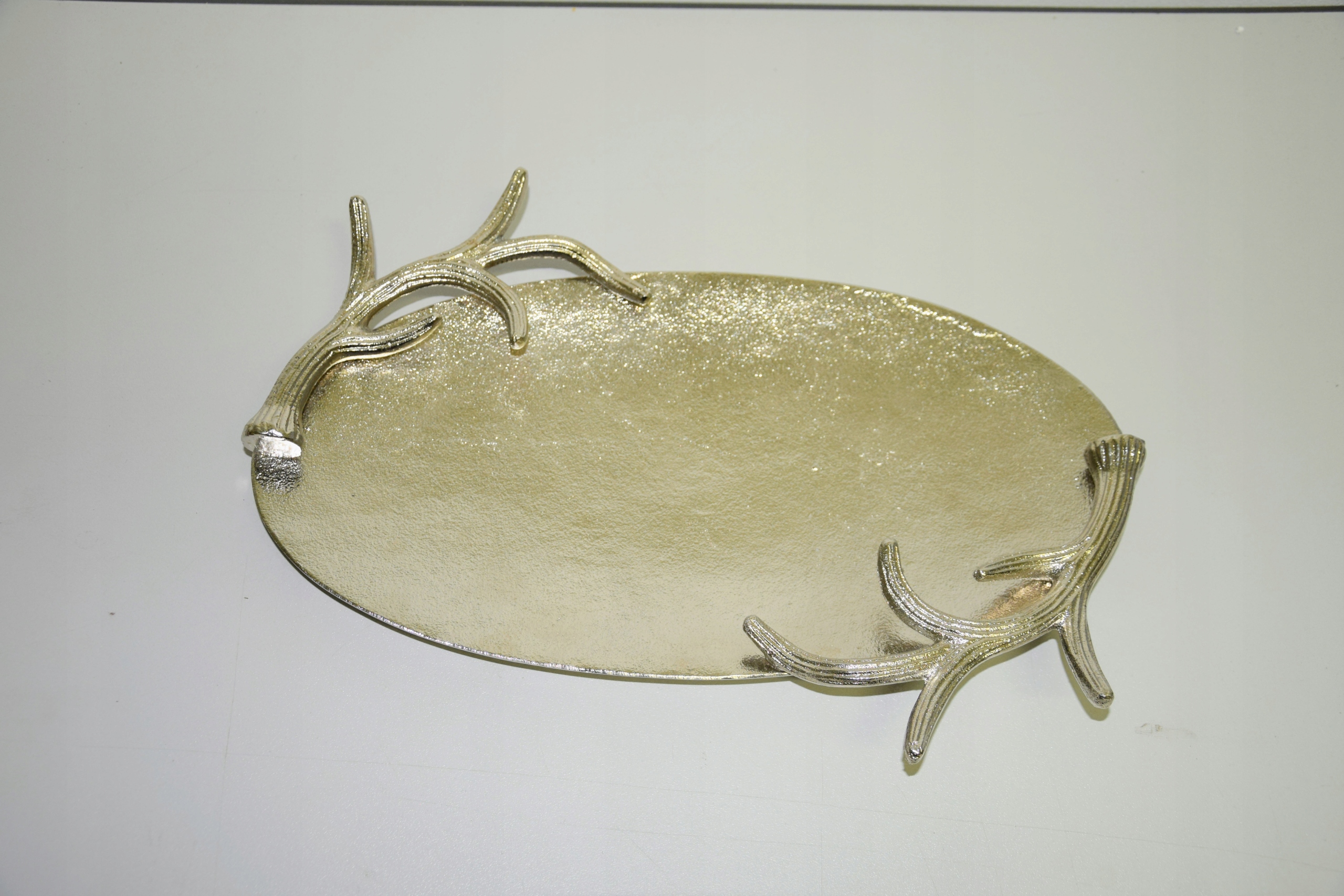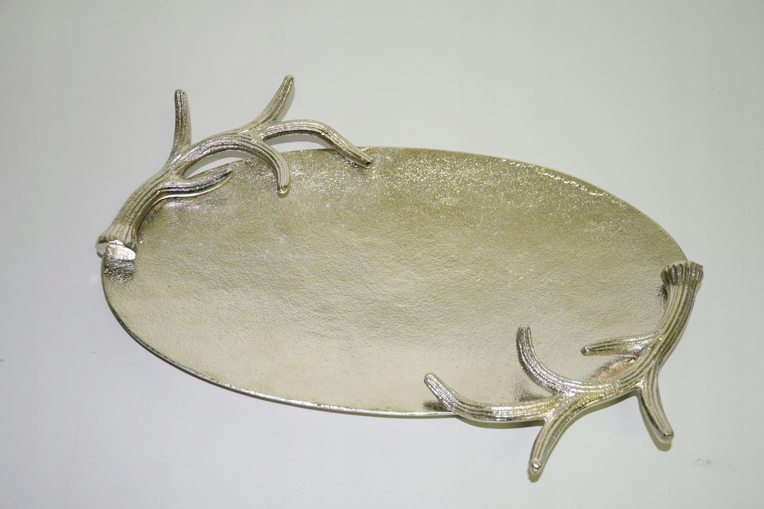 Овальный металлический поднос, серебро с размерами около 50x29,5x5,5 см. Чрезвычайно красивый поднос - идеально подходит для украшения в гостиной или в столовой. В лотке есть боковые украшения из рога (все изготовленные в металле) - могут использоваться в качестве ручек для переноски. Brzeg (рога) с высотой около 4,5 см. Красивый поднос для украшения и использования на кухне.