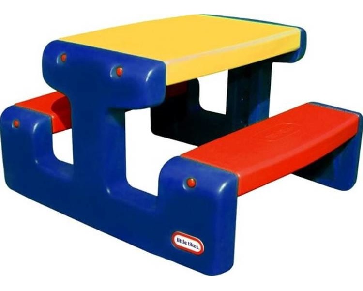 Большой стол для пикника, на котором могут разместиться до шести детей. Он очень подходит для еды и для детских игр на природе и дома. Комплект детского столика с двумя вытянутыми скамейками в сочетании желтого, синего и красного цветов изготовлен из качественного, прочного, простого в уходе материала, достаточно протереть влажной тряпкой.