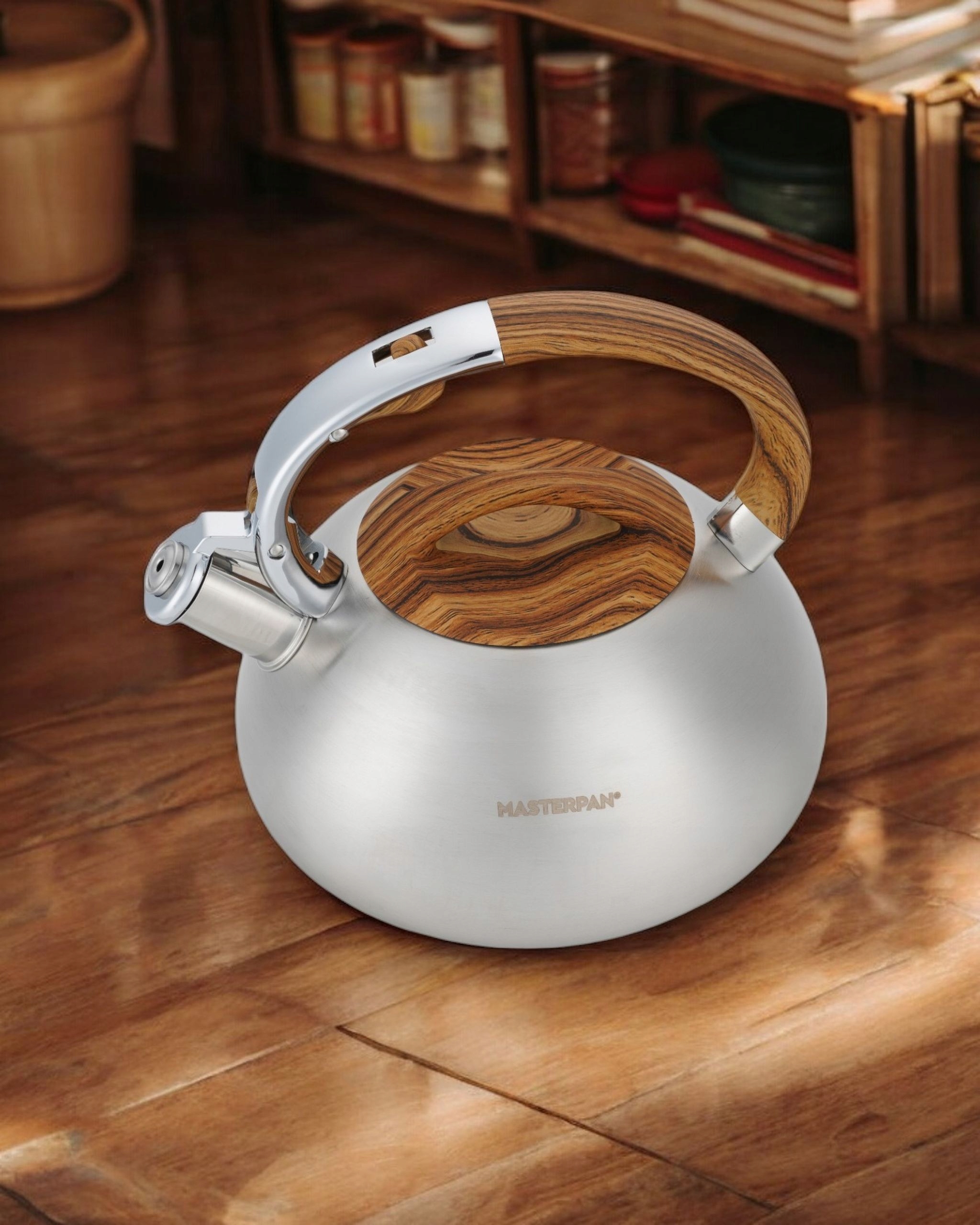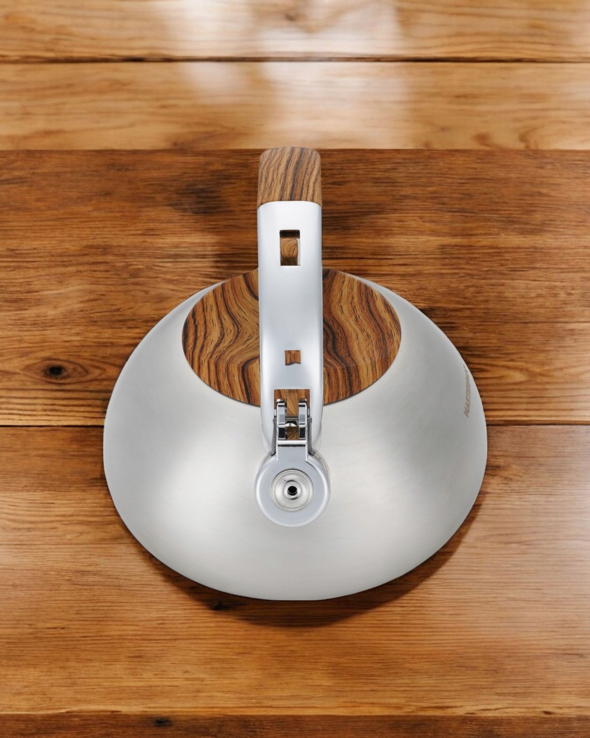 Стальный 3-литровый чайник с матовой отделкой и коричневой ручкой, имитирующей древесину
