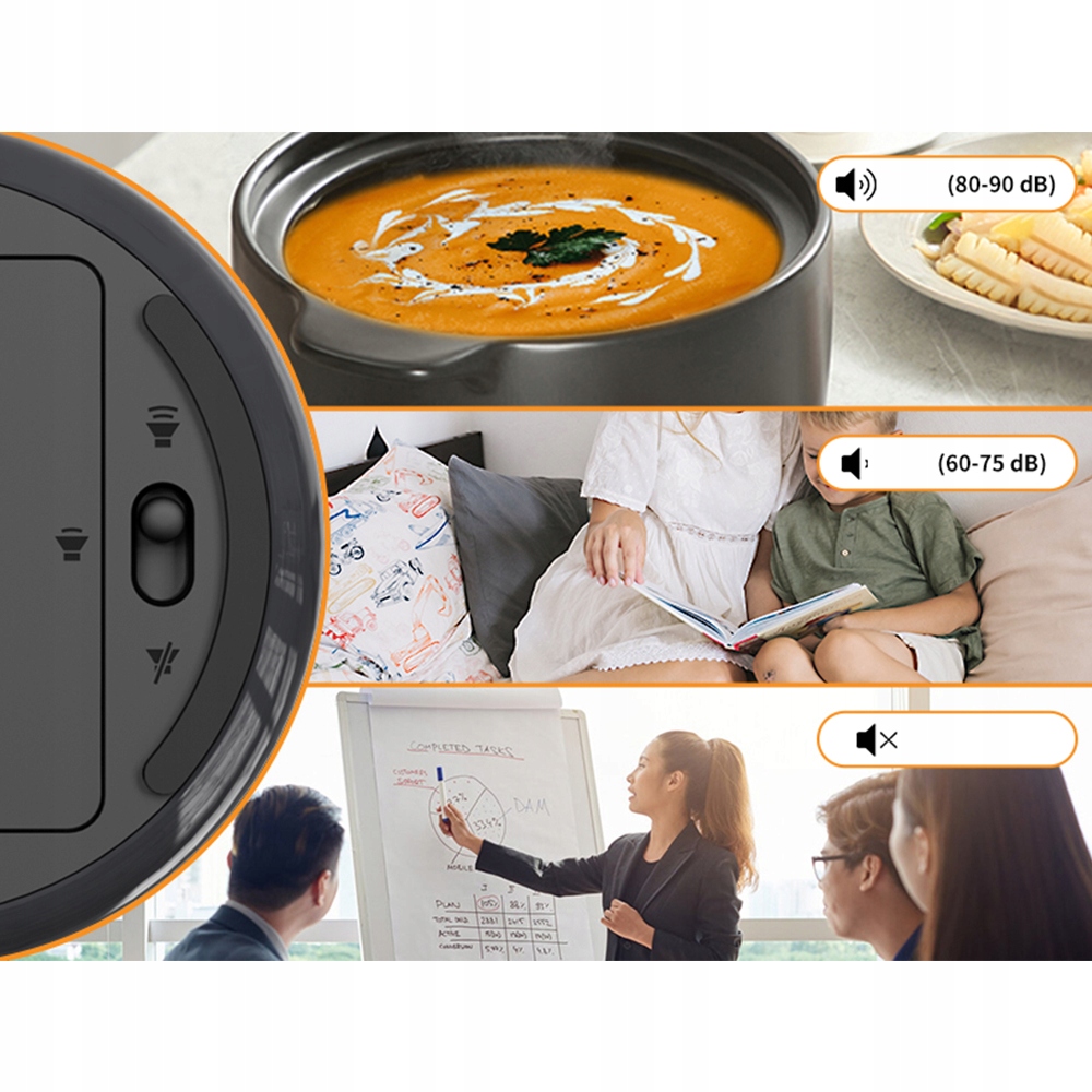 Большой черный экран и белые числа облегчают проверку оставшегося времени. Громкий (80-90 дБ), тихо (60-75 дБ) и кнопка молчания для удовлетворения ваших потребностей.