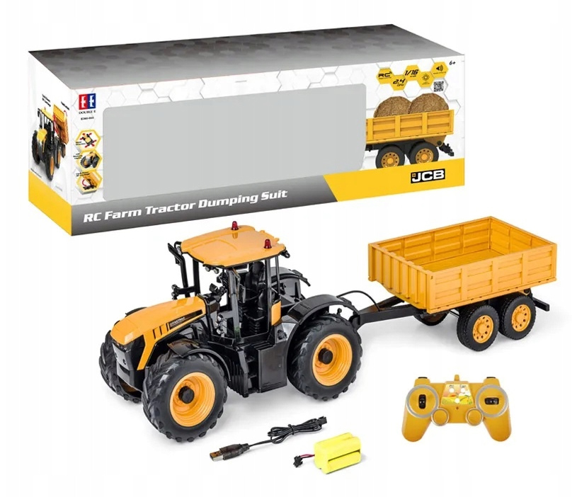 Трактор JCB с дистанционным управлением выполнен в масштабе 1/16, соединен с реалистичным прицепом, оснащен светом и звуком, обеспечивающими реалистичное развлечение.