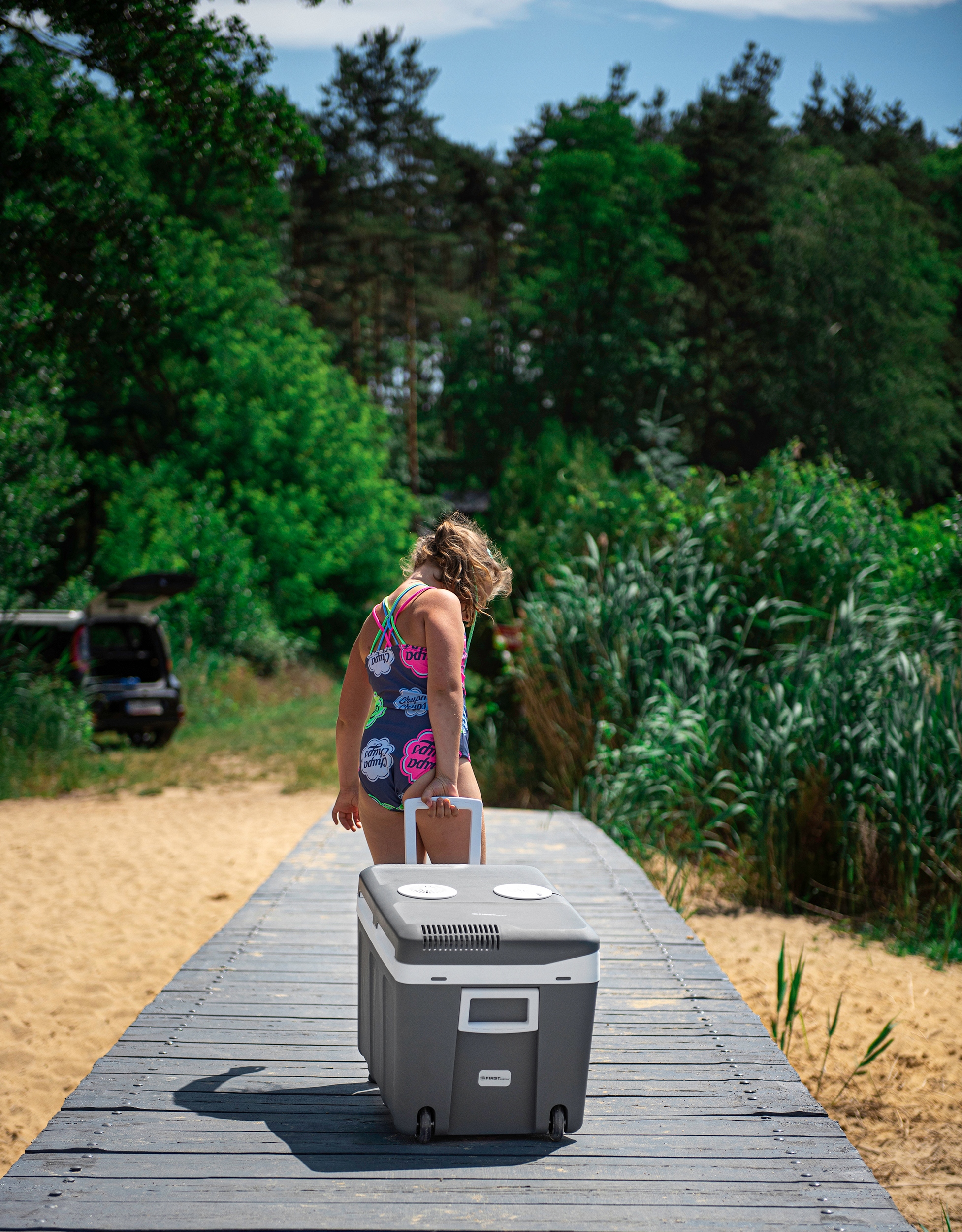 Благодаря своей вместительности холодильник оснащен ручкой и колесиками, чтобы вы могли тянуть его как угодно. .чемоданна случай, если вы загрузите холодильник до краев.
