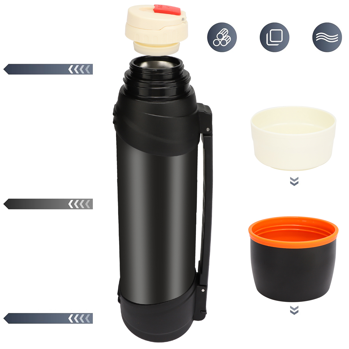 бутылка из нержавеющей стали, термобутылка с 2 чашками для питья, походная бутылка для воды с двойными стенками и потайными ремнями, круглосуточно горячая и холодная (черная) 🔥🔥🔥