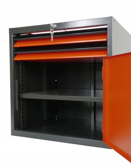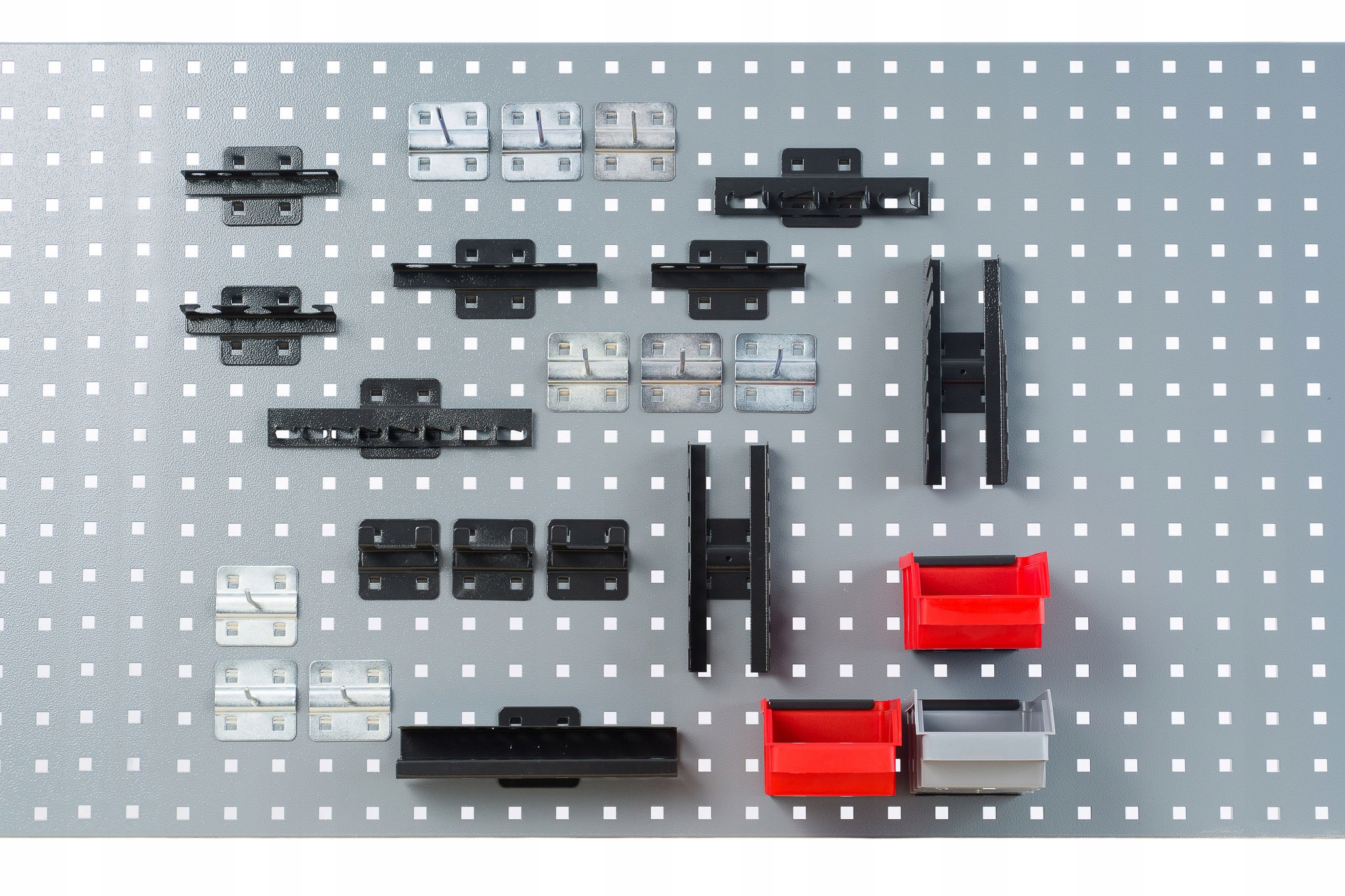 - оснащен перфорированной стенкой (квадратная перфорация), позволяющей произвольно организовать пространство подвесками и контейнерами