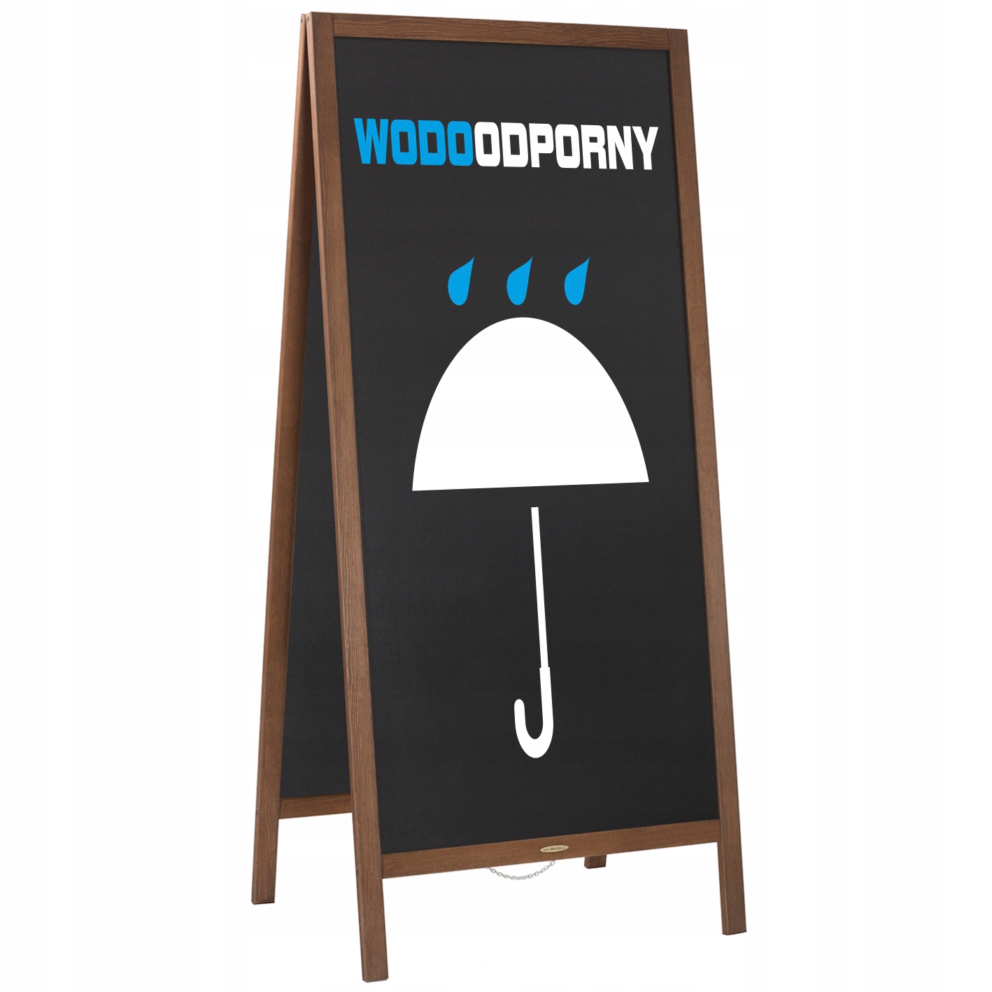 Большая водонепроницаемая вывеска XL (высотой до 160 см!) классического вида. Его можно выставлять на открытом воздухе независимо от погоды. Деревянный каркас доски промаслен, что защищает его от вредного воздействия погодных условий, таких как дождь и снег. Поверхность для письма изготовлена из водонепроницаемого АБС-пластика, очень прочного. Защита от влаги гарантирует длительное и комфортное использование доски. Благодаря своим размерам вывеска XL привлекает особое внимание, поскольку размещаемый на ней контент находится на уровне глаз потенциальных клиентов. Очень большие меловые доски могут содержать гораздо больше информации, чем доски стандартного размера.