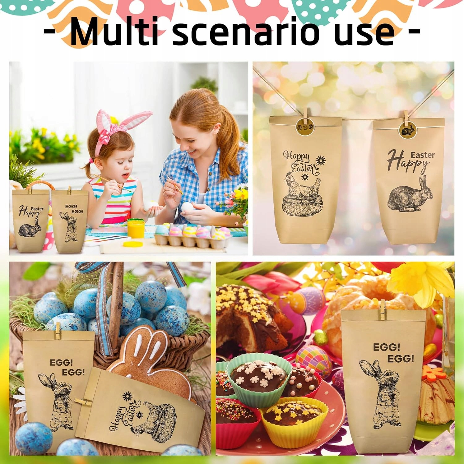 - Пасхальная тема - на пасхальных бумажных пакетах напечатаны узоры цыплят, кроликов, яиц и Веселой рождественской Пасхи и создайте сильную пасхальную атмосферу.