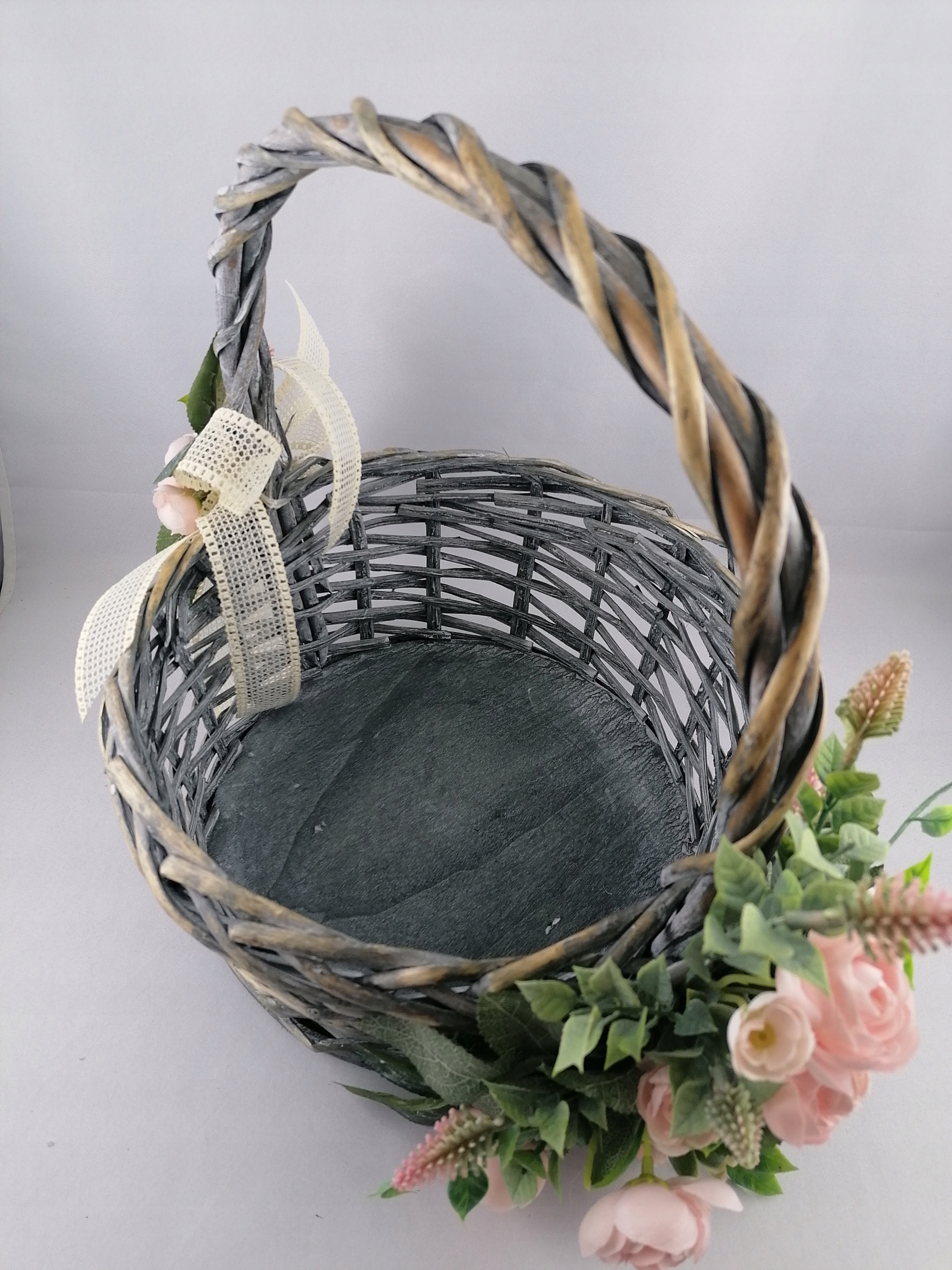 Плетеная корзина серо-золотого цвета, украшенная яркими цветами
