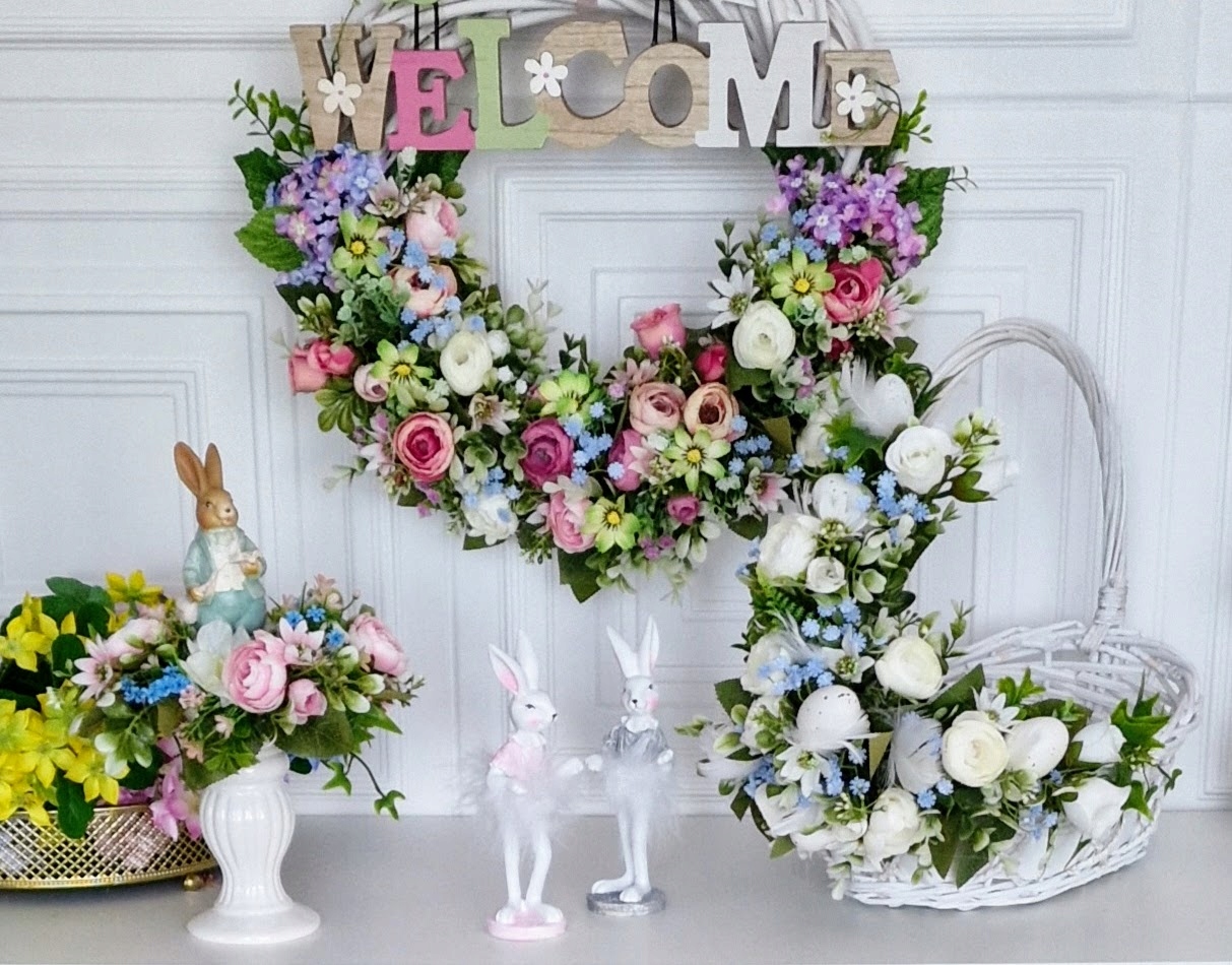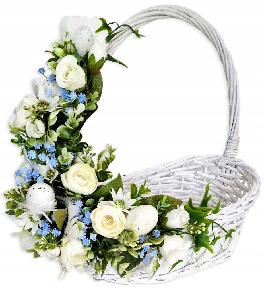 БЕЛАЯ ПЛЕТЕНАЯ КОРЗИНА, УКРАШЕННАЯ БЕЛЫМИ ВЕРБЛЮДАМИ, РОЗАМИ, СИНЕЙ ШКАЛОЙ, РАЗЛИЧНЫМИ АКСЕССУАРАМИ, ПЛАСТИКОВЫМИ ЯЙЦАМИ И ПЕРЬЯМИ