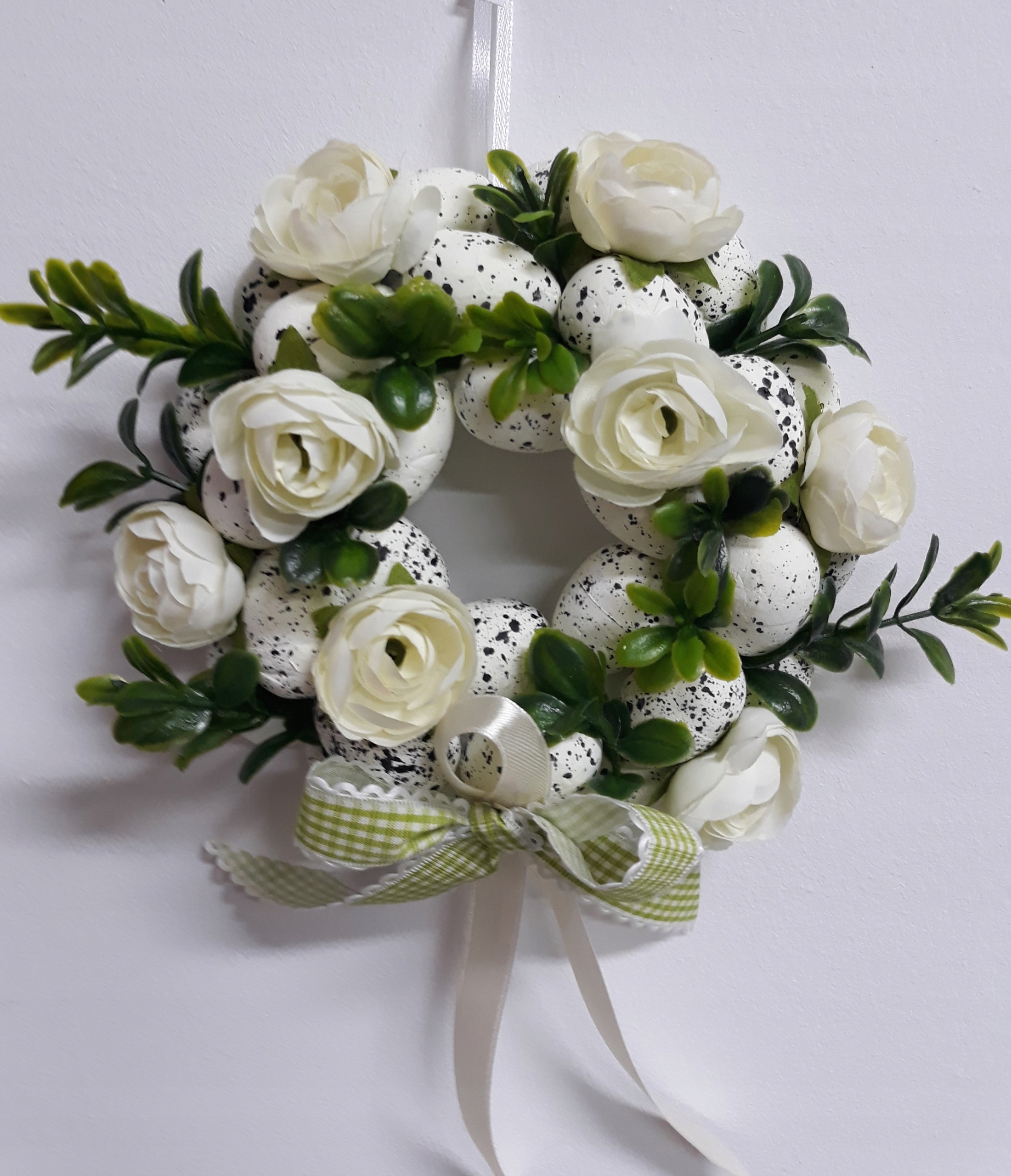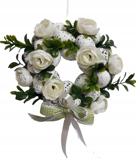 - Красивый декоративный венок из пенопластовых яиц, украшен ветками самшита, пионами и декоративным бантом.