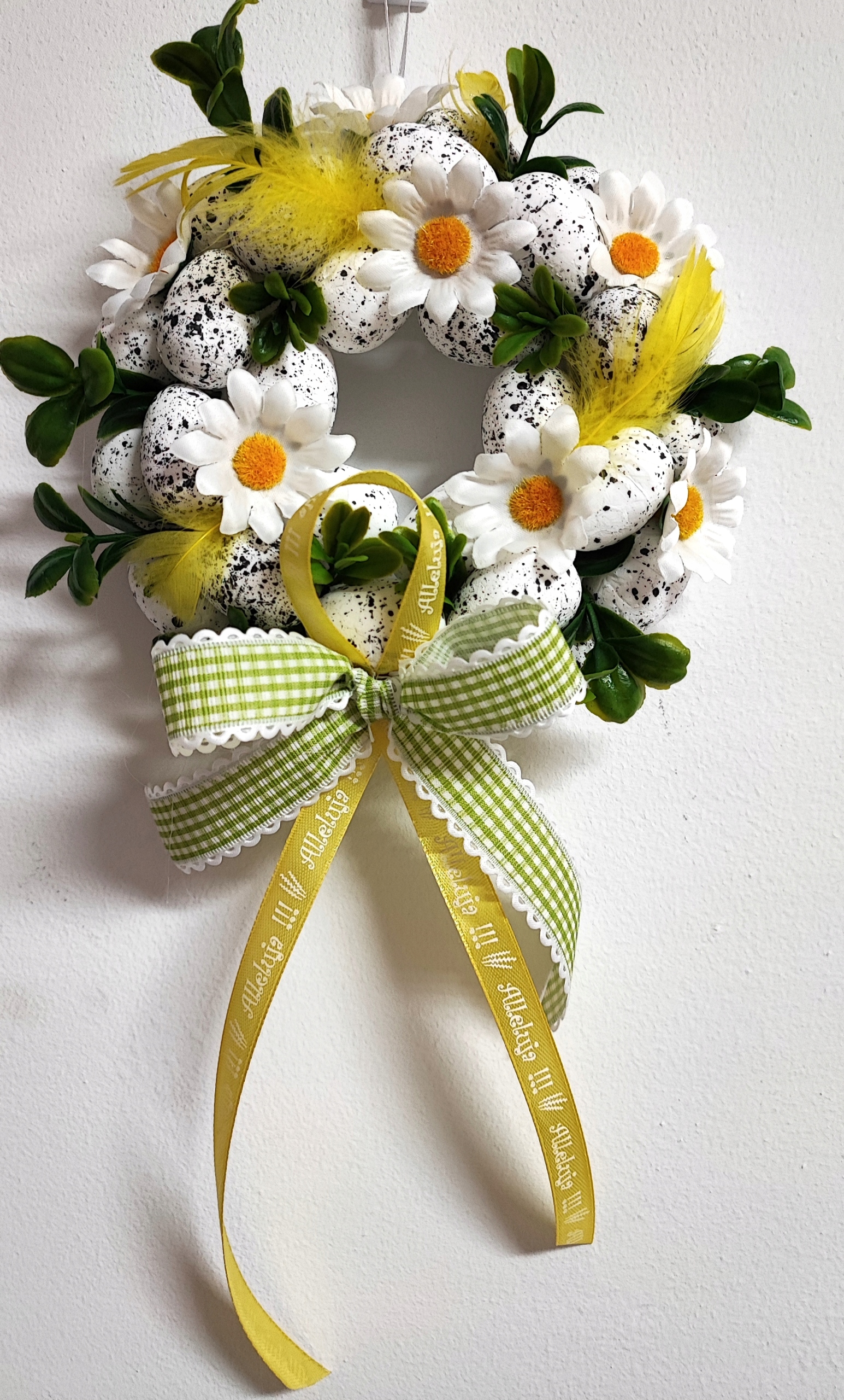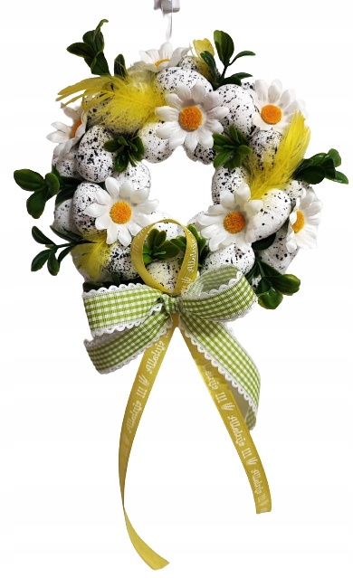 - Красивый декоративный венок из пенопластовых яиц., украшенный ветками самшита, ромашками, перьями и декоративным бантом.