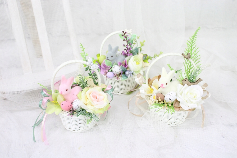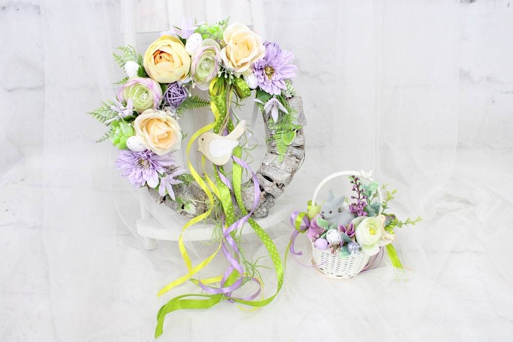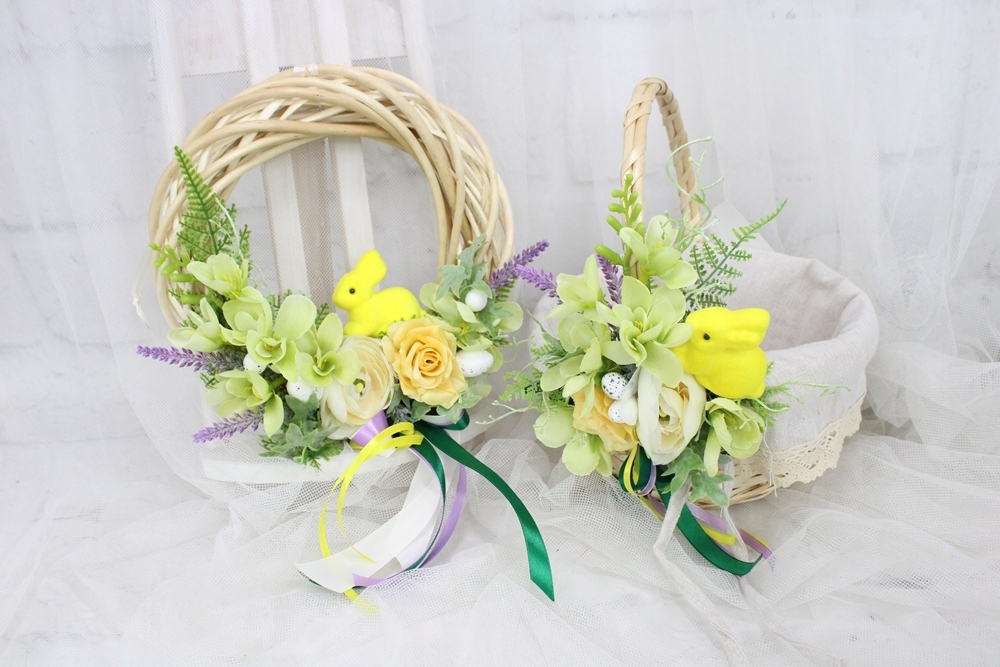 В наших предложениях у нас также есть композиции в аналогичном стиле, украшения для пасхальной корзины или корзины с готовым украшением