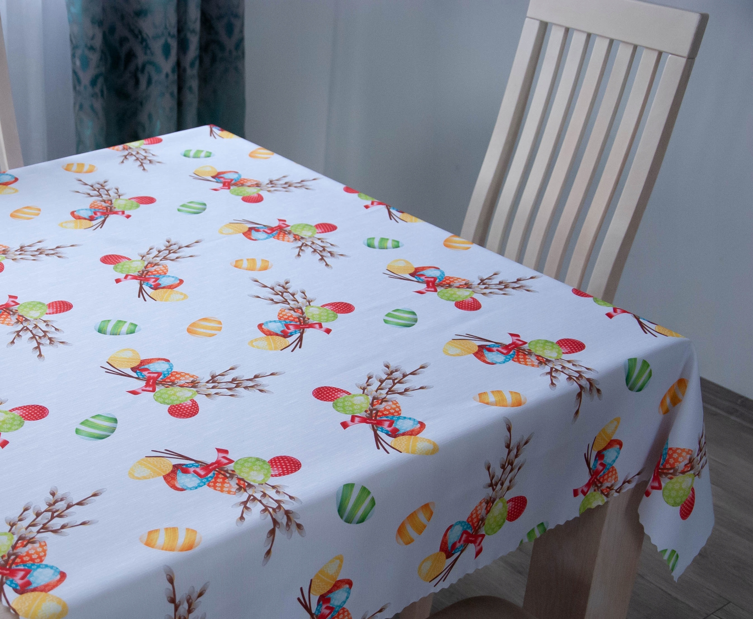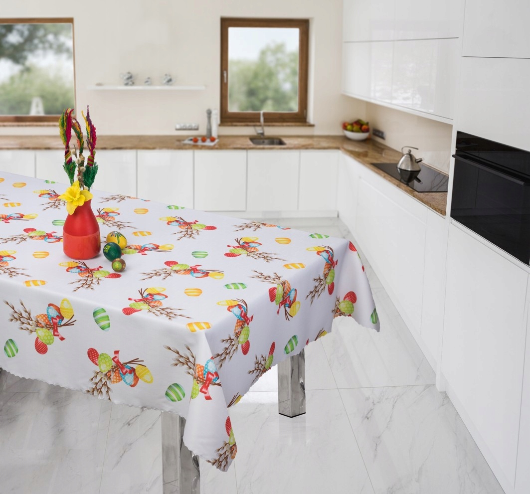 Весенняя грязеотталкивающая скатерть с разноцветными пасхальными яйцами с пальмами на белом фоне. Очень теплый и придает интерьеру поистине рождественскую атмосферу. Яйца – символ весны, возрождения, новых начинаний, а пальма – символ возрожденной жизни и радости.