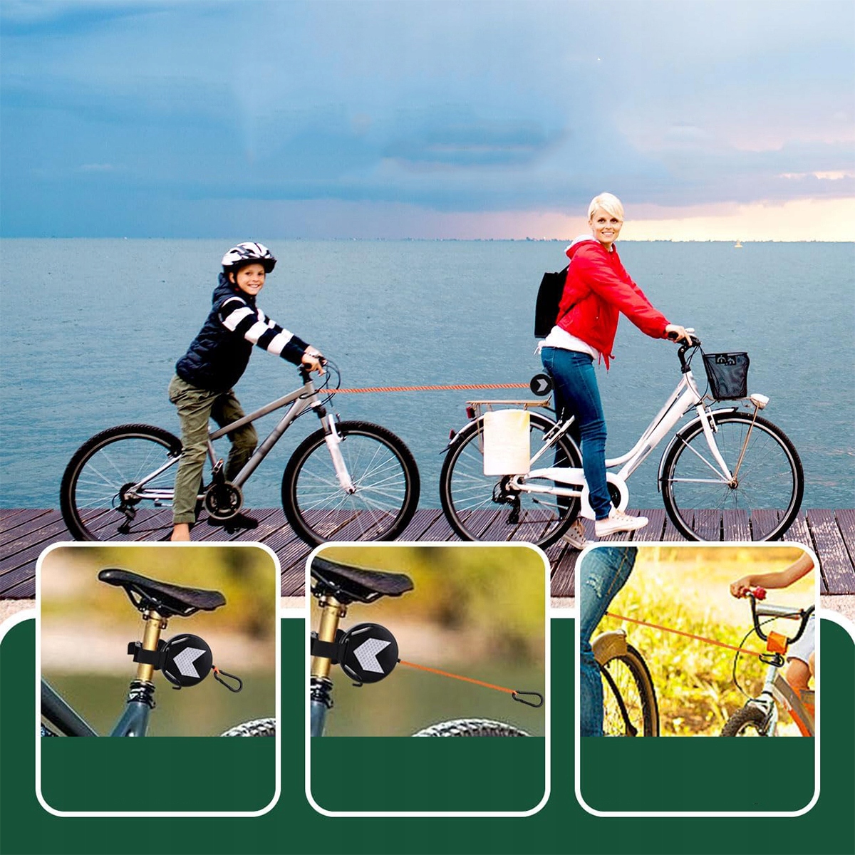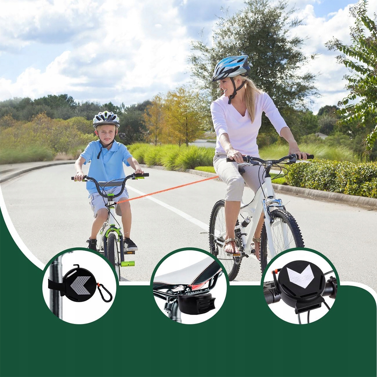 В комплект входит буксирная система с 2 метрами паракорда и карабином из нержавеющей стали, два троса с фиксаторами (один длинный и один короткий), гибкий прочный паракорд и две наклейки в форме стрелы. Трос со стопорным зажимом гарантирует безопасное и надежное соединение и предотвращает ослабление буксирного троса во время использования. Гибкий паракорд можно прикрепить к рулю велосипеда или обернуть вокруг руля для дополнительного комфорта.