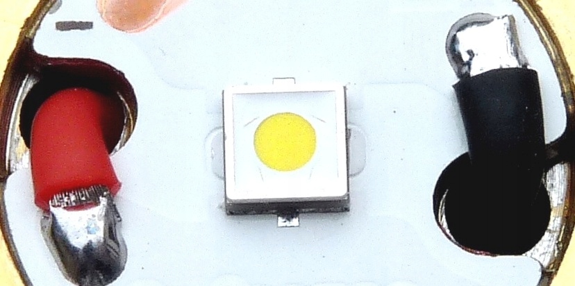 Светодиодный излучатель смонтирован на медной подложке типа DTP (прямая термопрокладка). Подложка припаяна к латунной «таблетке». Такие решения позволяют быстро отводить тепло, выделяемое диодом. Это существенно продлевает надежность и жизненный цикл изделия.