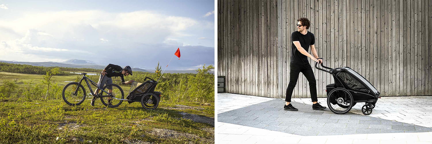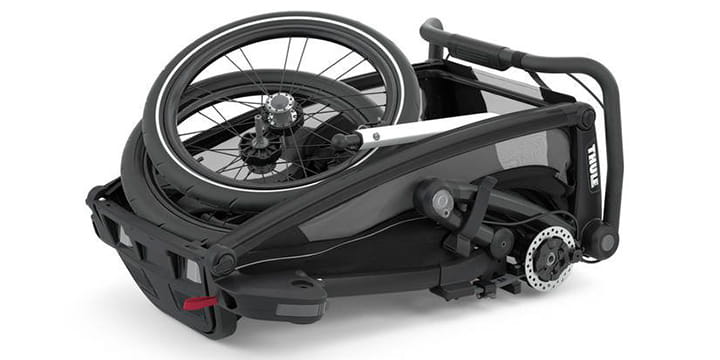 Прицеп Thule Sport оснащен двумя складными передними колесами, которые позволяют превратить его в чрезвычайно удобную и безопасную коляску.