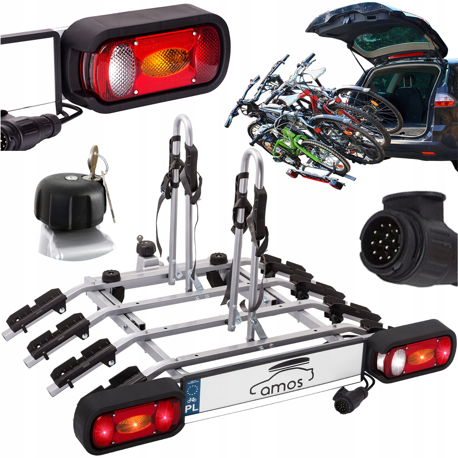 - Amos Tytan Plus 4 13-PIN багажник для велосипеда сделано он сделан из стали. Можно перевозить велосипеды любого типа и с любым диаметром рамы.