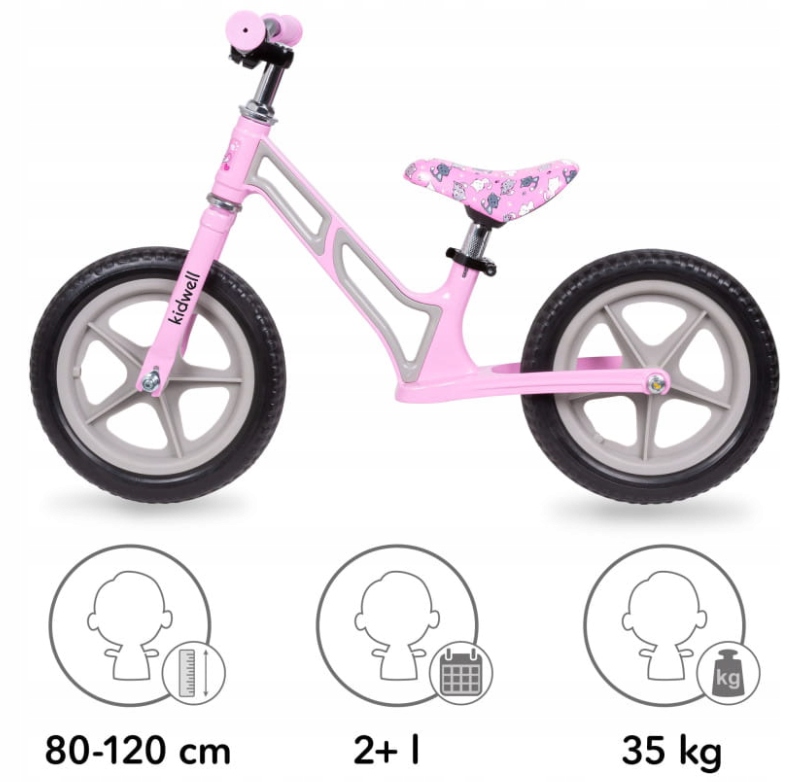 — очень легкий и современный велосипед. Беговел доставит детям большое удовольствие, во время которого они научатся сохранять равновесие. Благодаря беговелу дети не будут бояться обычного велосипеда и смогут быстрее начать на нем кататься. Беговел Kidwell был протестирован на прочность, радиус поворота, грузоподъемность и устойчивость к столкновениям. Он был спроектирован, изготовлен и сертифицирован в соответствии с требованиями Европейского Союза и соответствует европейскому стандарту безопасности EN 71.