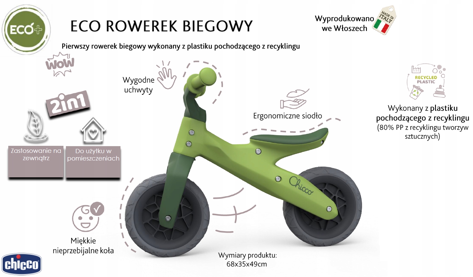 Беговик ECO+ — первый беговел Chicco, изготовленный из пластика из переработанных промышленных отходов (ручки, седло, рама).