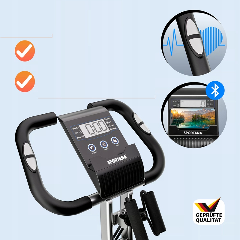На консоли велотренажера можно разместить мобильный телефон или планшет. Для оптимальной силовой тренировки верхних частей тела велотренажер оснащен двумя эспандерами.