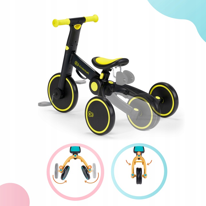Благодаря современным решениям родители могут изменить функции велосипеда за несколько минут – без необходимости использования инструментов ! Ваш малыш хочет покататься на трехколесном велосипеде? Всего несколько движений и все готово.