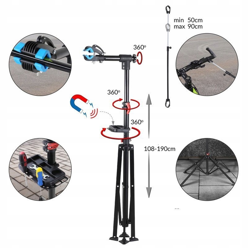 Пластиковые элементы изготовлены из качественного, ударопрочного АБС-пластика. Монтажная подставка проста и быстра, что позволяет точно выровнять велосипед и облегчает работу. Все движущиеся части оснащены быстросъемными креплениями или крепятся к основному рычагу с помощью большой барашковой гайки. Установка держателя подставки возможна между седлом и рулем, а также между стойкой крепления и рулем или передним колесом. Отрегулируйте расстояние велосипеда от подставки с помощью эластичного ремня, удерживающего руль или переднее колесо, в диапазоне от 50 до 90 см. Во время работы телескопическая стойка, регулируемая в диапазоне от 108 до 190 см, удерживает спортивный инвентарь в подвешенном состоянии, рама крепится регулируемым зажимом. Таким образом, ремонт можно выполнять на уровне глаз, а удобное рабочее положение защитит вашу спину и колени. Устойчивость конструкции гарантируется широким раздвижением ножек. Небольшое пространство не является проблемой: ножки основания не нужно раздвигать максимум до 144 см. Примечание. Защита от опрокидывания максимальна при максимальной ширине. Подвижные ножки компенсируют небольшие неровности, но следите за тем, чтобы подставка была прямой. MZH190 оснащен магнитным лотком для инструментов, поэтому вы не потеряете винты и гайки во время работы. На велосипедах с толщиной рамы более 60 мм захват можно легко увеличить снизу с помощью винта с накатанной головкой. Большой захват со съемными нескользящими резиновыми накладками имеет ход 30 мм. Внимание! Каркас следует тщательно очистить, иначе могут появиться царапины от трения камней, песка и т. д. о ручку.