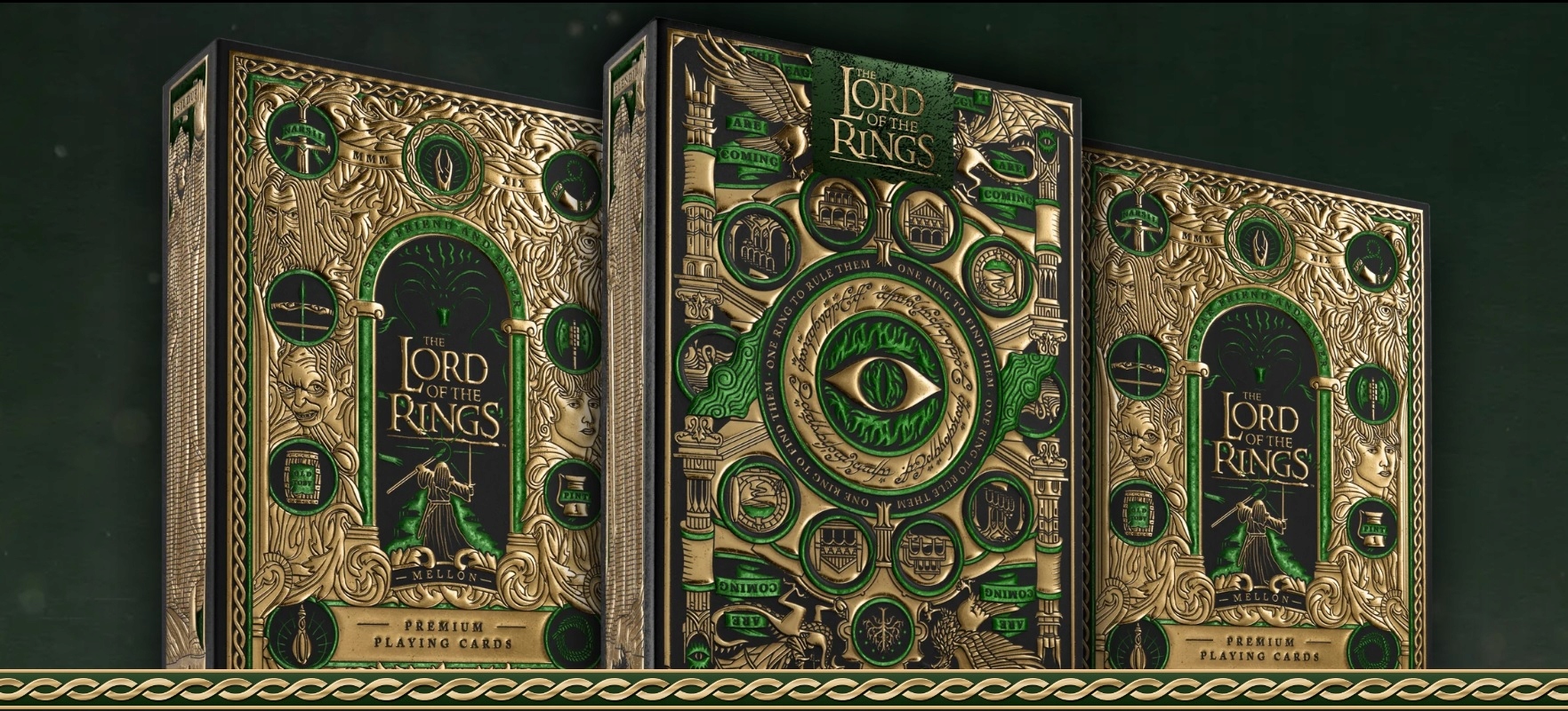 Упаковка, изготовленная из золота, которое Саурон использовал при выковке Единого Кольца, и изумрудно-зеленой фольги, отражающей пейзаж Шира, действительно единственная в своем роде. Сами карточки производятся в США и напечатаны на сертифицированной FSC бумаге, полученной из устойчивых лесов, с использованием чернил на растительной основе и ламината на основе крахмала.