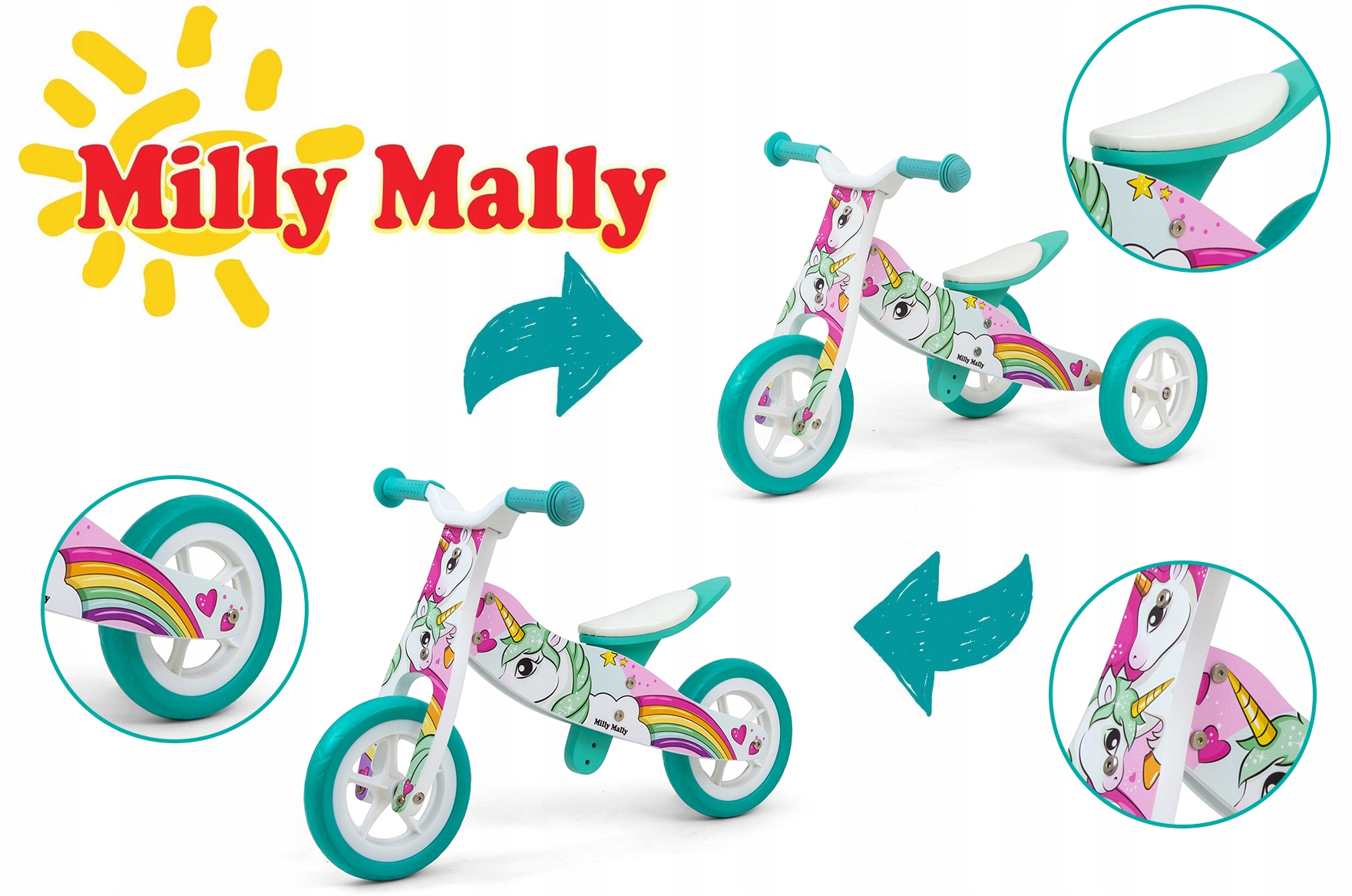 Неоценимым преимуществом является возможность переоборудования из трехколесный велосипед в двухколесный бегун. Благодаря этому ваш ребенок сможет дольше наслаждаться использованием этого уникального велосипеда, который будет «расти» вместе с ним. Мягкие нескользящие ручки с чехлами защитят руки ребенка, а регулируемая высота сиденья позволит подогнать высоту под рост ребенка. Он также оснащен ограничителем рулевого управления, который не позволяет ребенку поворачивать рулевое колесо и делает невозможным вождение.