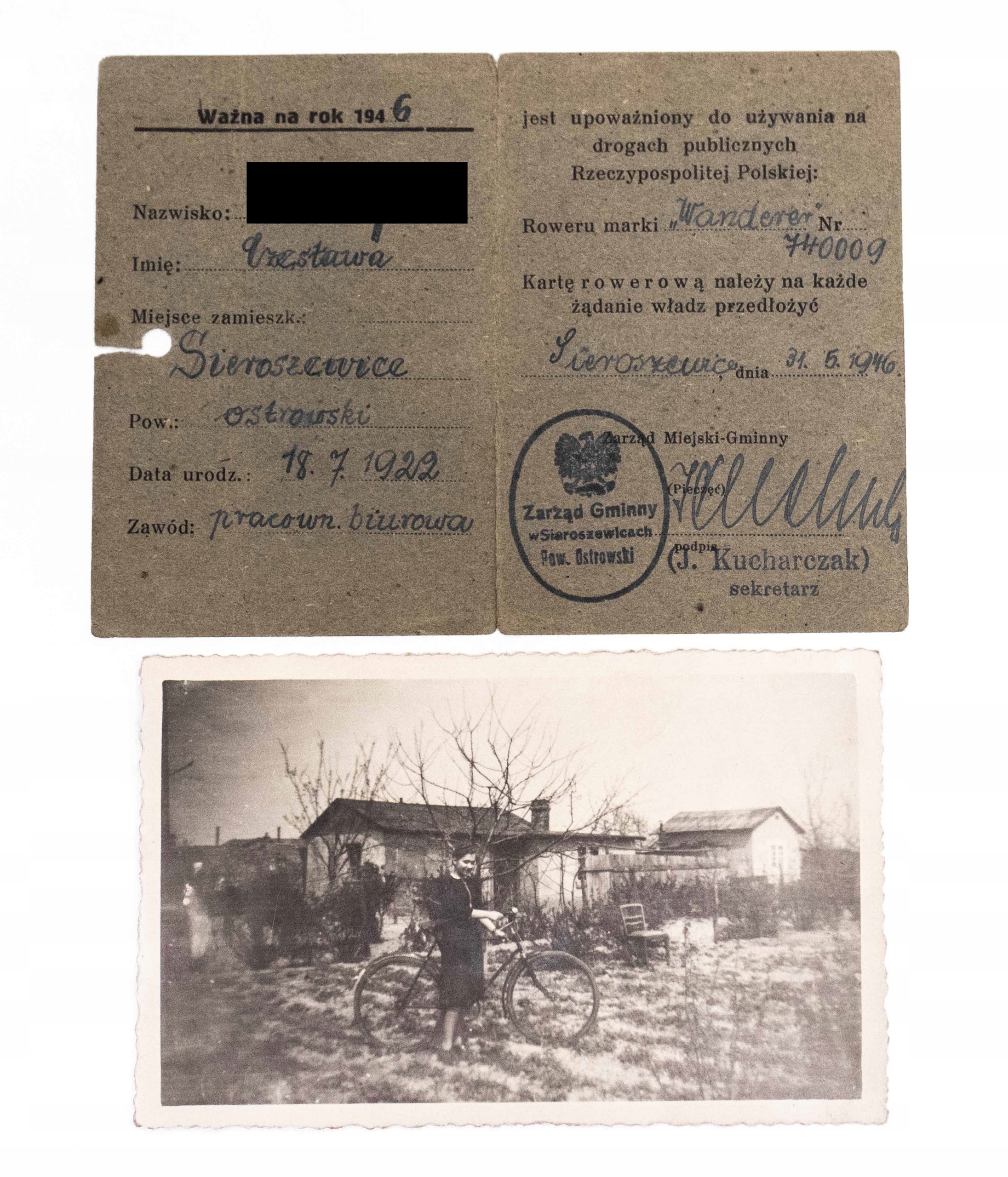ВЕЛОСИПЕДНА КАРТКА + ФОТОГРАФІЯ, СЕРОШЕВІЦЕ 1946