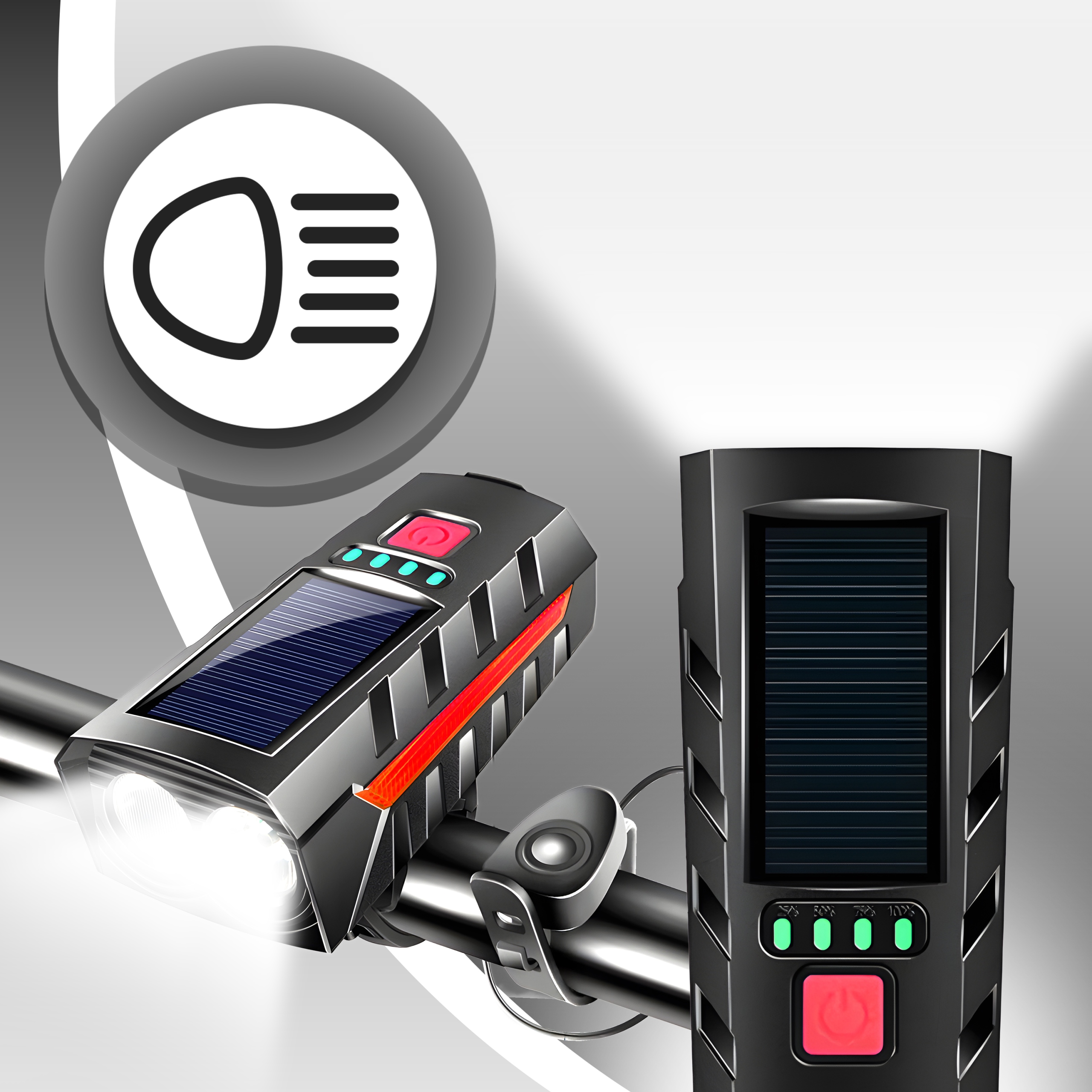 ✏️ Питание от солнечной батареи и USB ☀️ Встроенный громкий звуковой сигнал ✉️ Индикатор уровня заряда батареи ✔️ Водонепроницаемый IPX4 ♥️ Прочный корпус из АБС-пластика и металла ♣️ Яркий светодиодный фонарь спереди и сзади ♠️ Простая установка на руле ⭐ Идеально подходит для ночных поездок