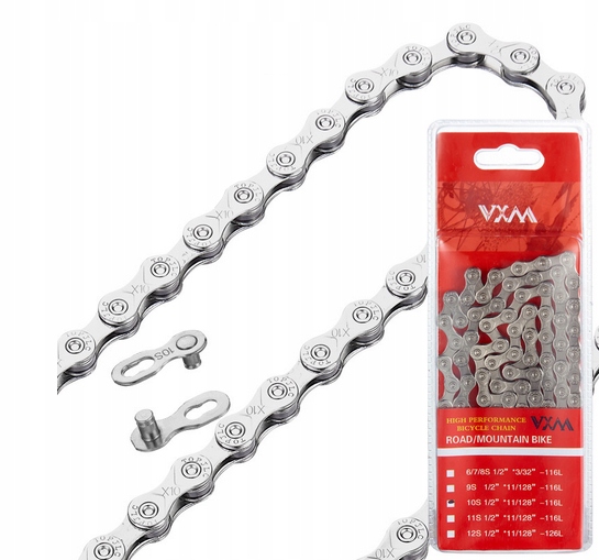 включала 10-ступенчатую велосипедную цепь с размерами 1/2 "x 11/128" и состоят из 116 ячеек. (116 ссылок, достаточно для большинства велосипедов, просто адаптируйтесь к необходимой длине)