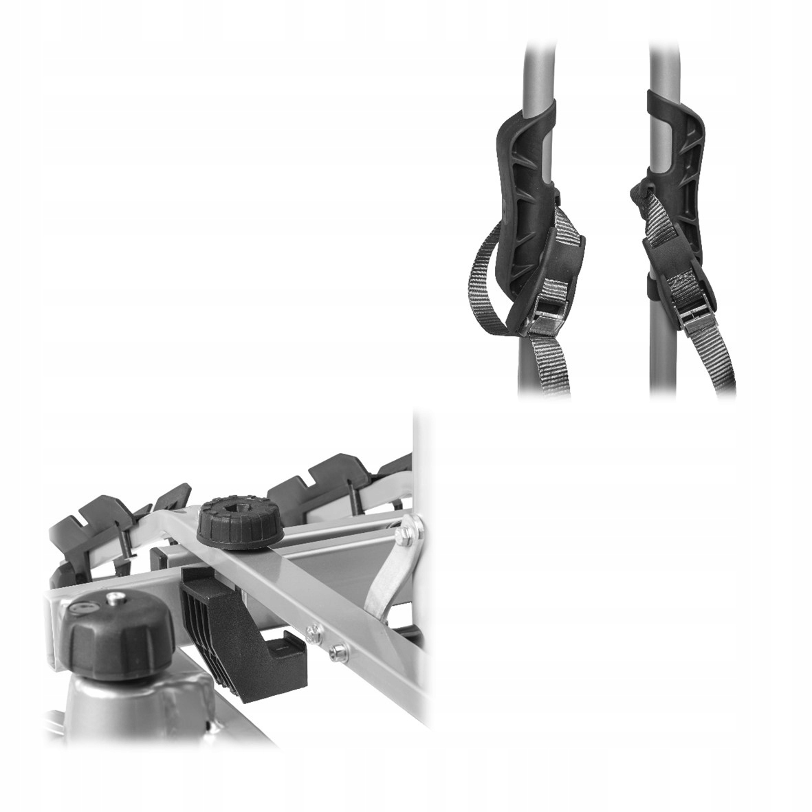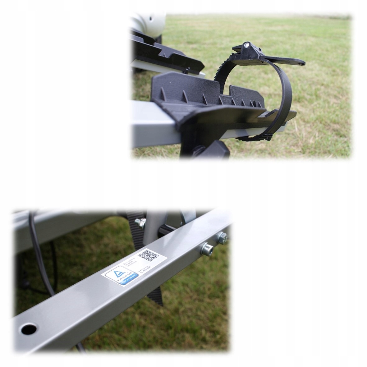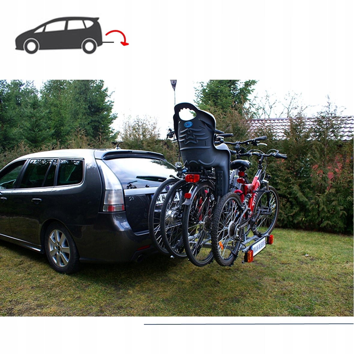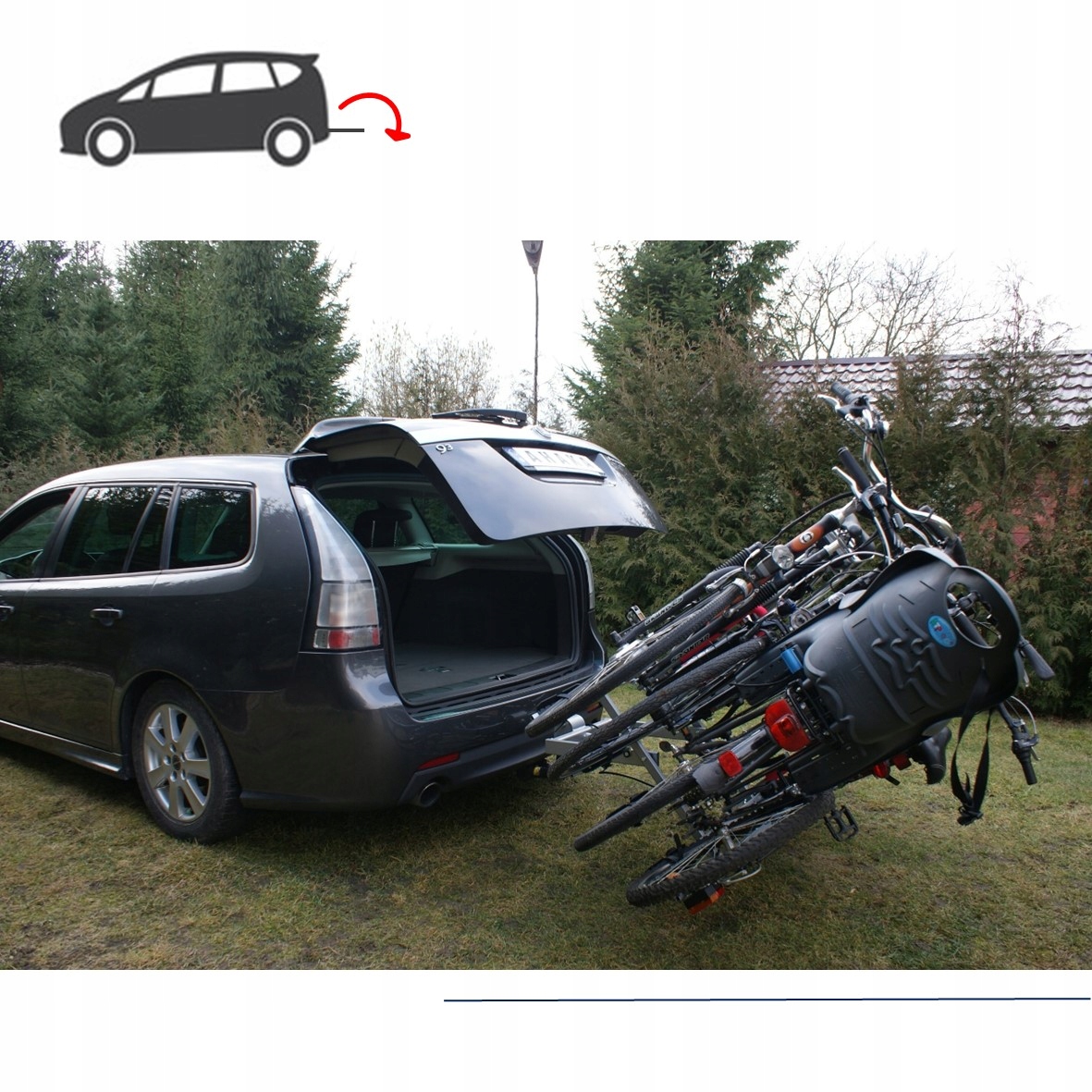 Основными особенностями этого багажника являются очень прочная стальная рама, стальные направляющие для велосипедных колес, головка, позволяющая очень быстро установить багажник на шар фаркопа, а также функция наклона, позволяющая открыть багажник. люк автомобиля даже при перевозке велосипедов.
