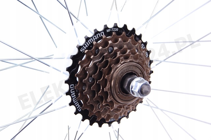 Усиленное заднее колесо 26 дюймов с заводной кассетой и. Конический обод из алюминия, имеет 36 спиц черного цвета. Ступица на шарикоподшипниках. В комплект также входит 6-скоростная стальная обгонная муфта Shimano.