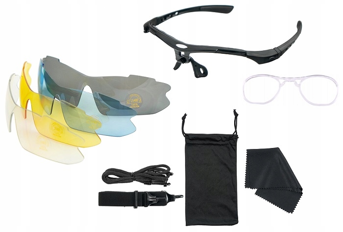 Помимо оправы и 5 сменных линз, солнцезащитные очки также оснащены дополнительными аксессуарами. На оправе очков установлена дополнительная оправа, позволяющая установить корректирующие линзы. Гибкое сменное оголовье позволит комфортно использовать очки даже в самых динамичных видах спорта и ситуациях. Для дополнительной безопасности используйте веревку, чтобы повесить очки на шею. В комплект также входит салфетка для чистки очков и сумка для очков.