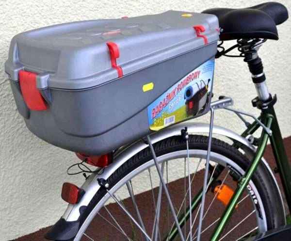 Велобагажник с откидной крышкой и запирающейся защелкой, изготовлен из прочного пластика.