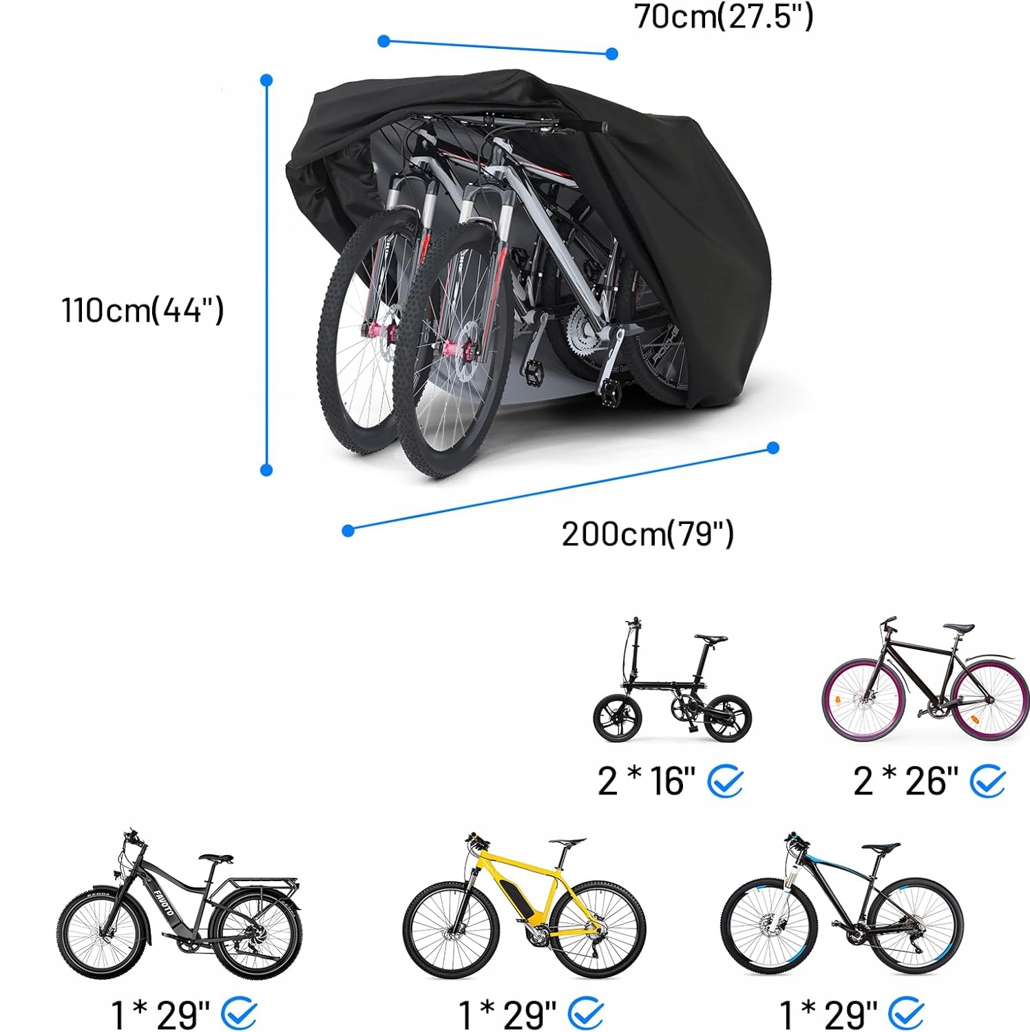 Размеры 200 x 70 x 110 см — подходит для велосипедов диаметром 29 дюймов или двух велосипедов диаметром 26 дюймов, включая горные, гоночные и электрические велосипеды.
