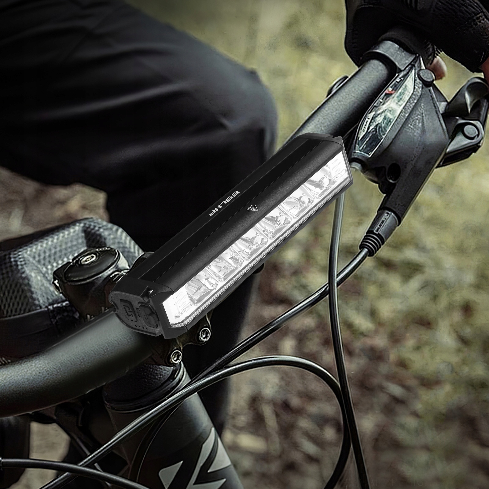 Переднее освещение обеспечивает яркость до 150 метров. Лампа излучает белый свет мощностью до 1400 люмен и имеет 4 режима освещения.