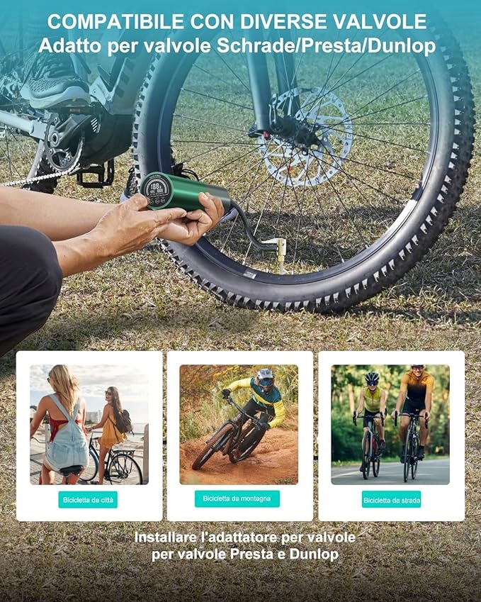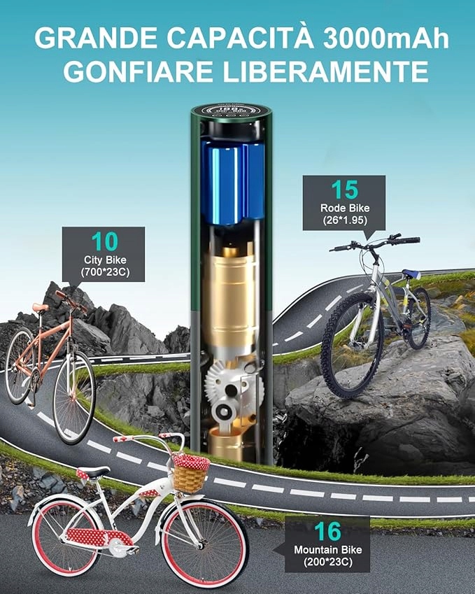 Этот портативный воздушный компрессор оснащен интегрированной батареей 3000 мА, он может надувать 3 автомобильных шин или 16 шин для бицикле или 40 бициклевых шин только с одной зарядкой. Он обеспечивает сильное давление до 120 фунтов на квадратный дюйм и воздушный поток 20 л/мин, что означает, что велосипедные шины могут быть надучены в течение 2 минут от 0 до 50 фунтов на квадратный дюйм