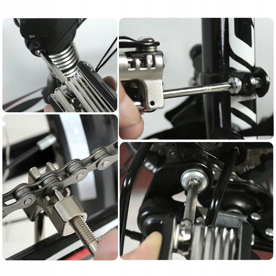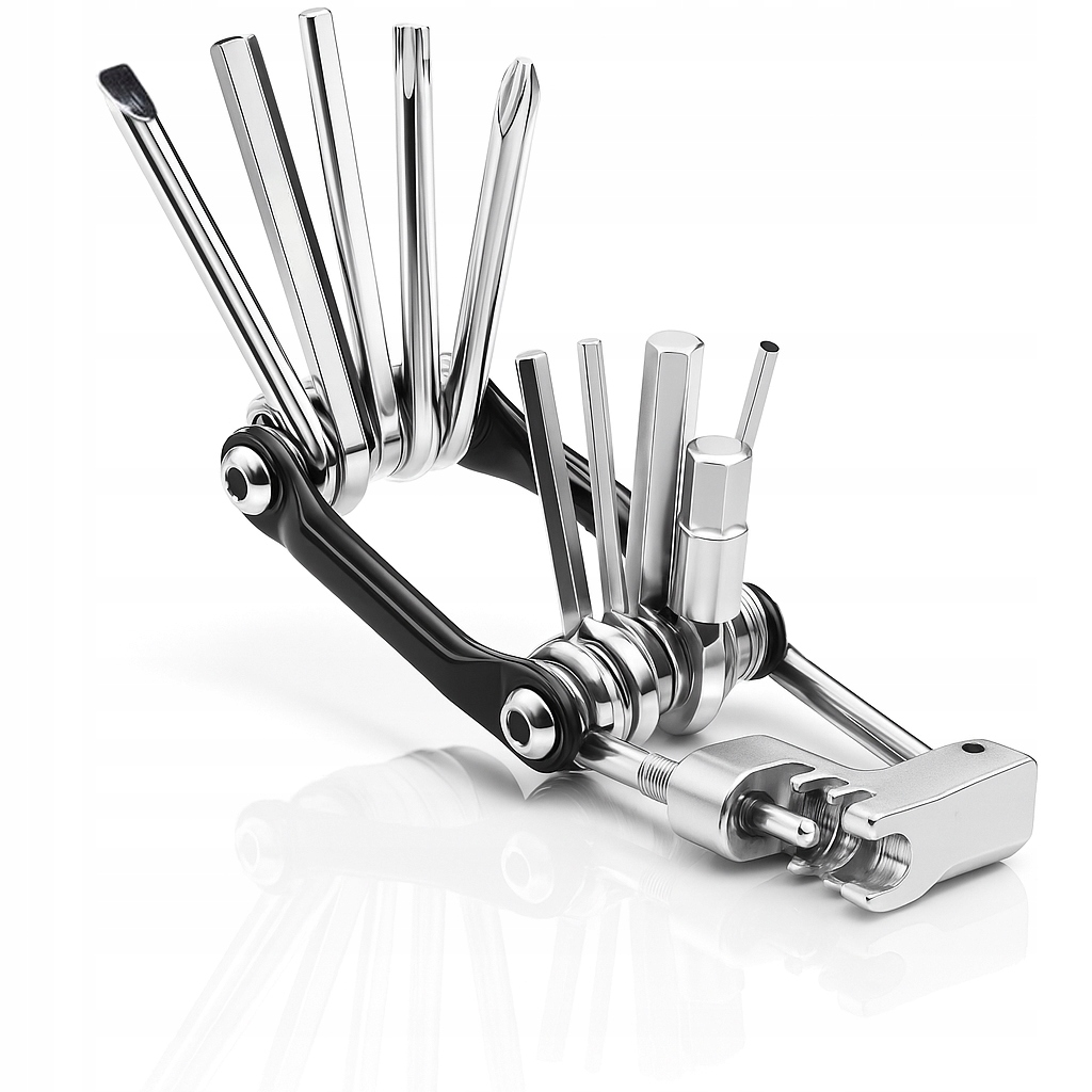 Набор создан для того, чтобы объединить все самые необходимые функции в одном компактном инструменте. Каждая деталь изготовлена из прочной, износостойкой нержавеющей стали и соответствует типичным велосипедным винтам и компонентам. В комплект входят: