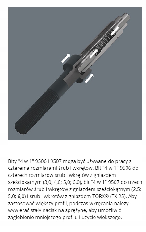 Одна бита подходит для болтов и винтов четырех разных профилей. Значительное снижение веса более чем на 50%. Благодаря значительной экономии места набор Bicycle15 идеально подходит для мобильных приложений. Использование профилей большого размера возможно благодаря профилю меньшего размера, закрепленному на пружине. Биту с шестигранным хвостовиком 1/4 дюйма (серия Wera 1) можно использовать, например, с трещотками и рукоятками с держателем бит от Rapidaptor. Шинный рычаг 9504 оснащен 1 Ручка диаметром 1/4 дюйма, позволяющая прикреплять насадки 1/4 дюйма. Поставив рычаги шины 9504 друг на друга, биты 4 в 1 можно поместить в держатель насадок 1/4 дюйма, получив таким образом отвертку. . Рычаг для шин 9505 также используется для демонтажа клапанов и сдувания шин. Рычаг для шин и насадки «4 в 1» можно соединить вместе, что делает весь комплект компактным и защищенным от потери.