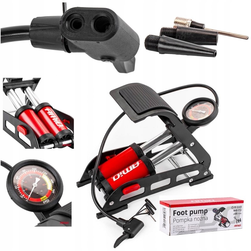 Двойной насос ног с твердой конструкцией , изготовленной из прессованного лакированного стального листа толщиной 3 мм. Педали Увамы для лучшей стабилизации. прозрачный датчик давления , показывающий в стержнях (0-11) и PSI (0-160). Долговечный и гибкий шланг с длиной 75 см