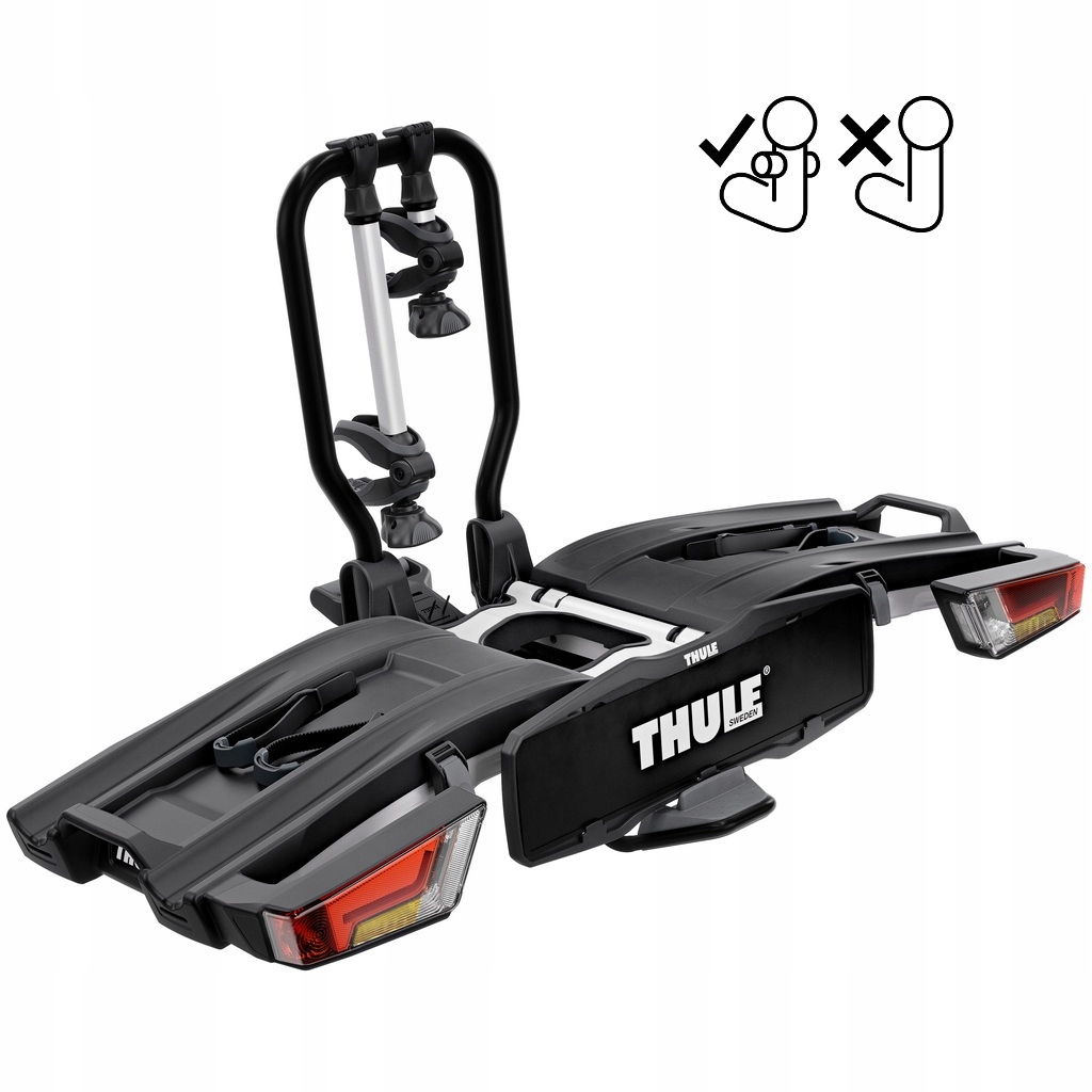 - Легкое крепление велосипедов с помощью съемных кронштейнов с блокируемыми ручками Thule AcuTight, которые щелкают, указывая на достижение оптимального усилия крепления.