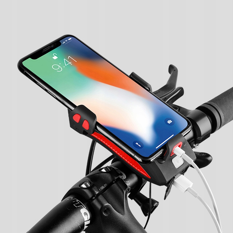 - Велодержатель для телефона со встроенным аккумулятором, светодиодной лампой и звуковым сигналом.
