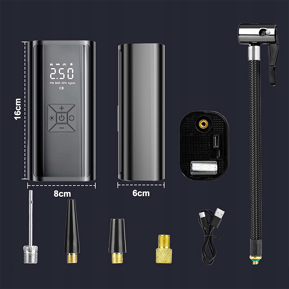✅Этот электрический воздушный насос имеет встроенный аккумулятор большой емкости 6000 мАч. Это не только воздушный насос, но и блок питания. Вы можете подключить зарядный кабель для зарядки мобильного телефона и ноутбука. Он также оснащен интерфейсом типа C и автомобильным интерфейсным шнуром питания, который удобно и быстро заряжать.