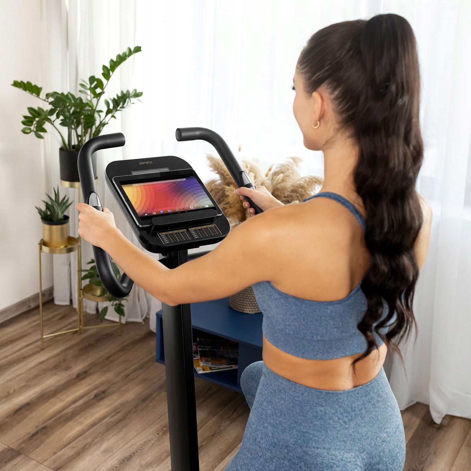Современные удобства, использованные в велосипеде, гарантируют высокий комфорт во время тренировок. Держатель для мобильного устройства позволяет смотреть фильмы или слушать музыку, что разнообразит вашу деятельность. Противоскользящие педали с крепежными ремнями повышают устойчивость стопы, снижая риск поскользнуться.